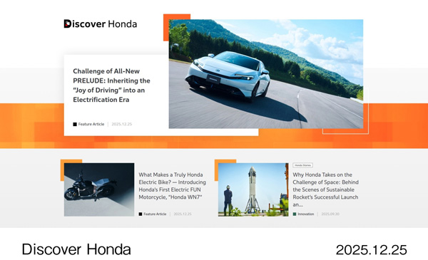 TOKYO, Japan, December 25, 2025 – Honda Motor Co., Ltd. today launched a content curation media platform, Discover Honda, on its corporate information website*1. Discover Honda is a media platform that holistically curates and clearly communicates a wide range of Honda initiatives, including Honda products, technologies, designs, and the thoughts of Honda associates who create them, as well as various corporate activities including the environment, safety and corporate social responsibility (CSR) initiatives.