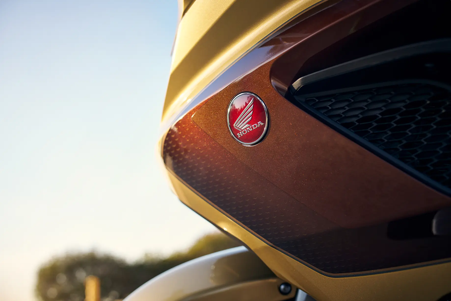 O desenvolvimento do emblema presente em cada motocicleta levou anos. Foi criado em 1988 e aprimorado em 2001, utilizando técnicas tradicionais japonesas vistas em espadas, ferramentas rituais e medalhas de honra. Um reconhecido "Mestre Artesão Contemporâneo" gravou o molde original, que foi então reproduzido com tecnologia de ponta. O novo emblema refletia "como cada produto é cuidadosamente fabricado pela equipe da Honda, que garante a qualidade consistente da Honda em cada etapa, desde o desenvolvimento, passando pela produção, até as vendas, e entrega a garantia Honda a cada cliente". É utilizado para todos os produtos da divisão de motocicletas.