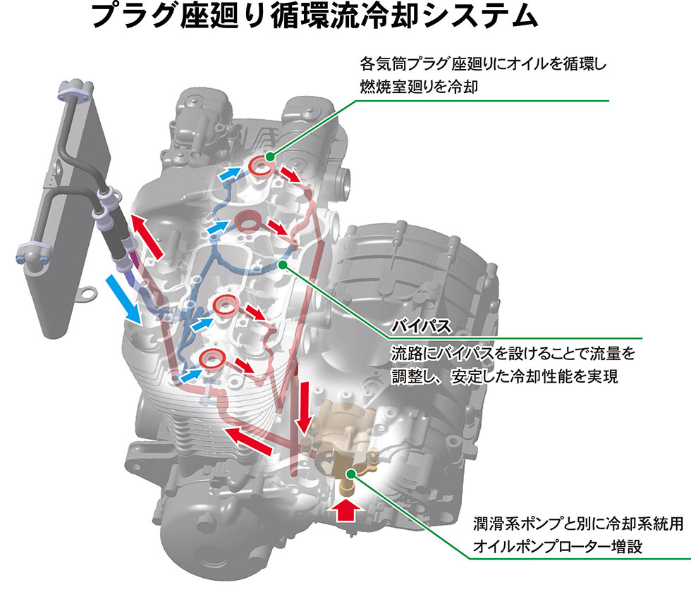 エミッション性能の向上には、安定した燃焼の効率化が欠かせません。エンジン内部で最も高温になりやすい排気ポートとスパークプラグ座周辺に、オイルを循環させて燃焼室回りを冷却する方式を採用しました。また、オイルクーラーの採用によって効率の高い冷却システムを実現したのです。