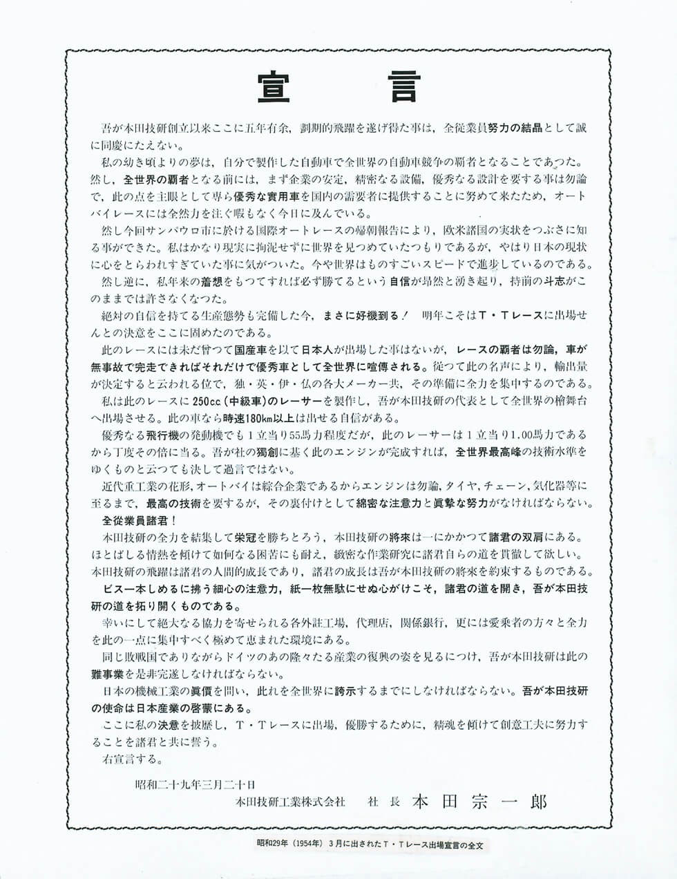 やがてHondaが日本一の二輪メーカーに成長し、世界一をめざした1954年に、本田宗一郎は世界のレースへ挑戦を開始する「宣言」を発した。その冒頭にこうある。