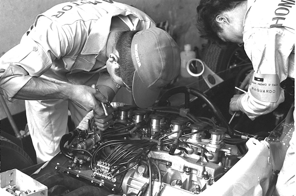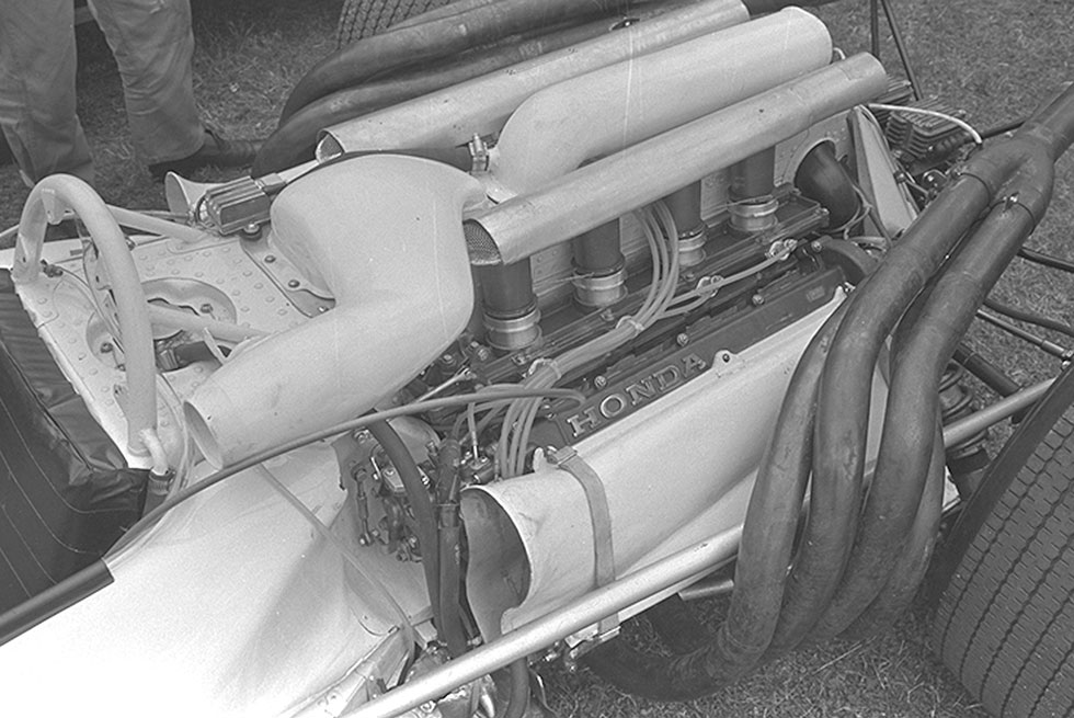 1961年にオートバイ世界選手権の125ccと250ccを横置きマルチリンダーエンジンで制覇した本田宗一郎にしてみれば、当然のことながらF1も横置きレイアウトとするのは朝飯前のチャレンジ精神である。そのアイデアを現実のメカニズムに仕上げなければならない現場の技術者たちは、勇猛果敢に働いた。初めて設計製造するF1マシンだが、やってやれない仕事ではない。彼らにはオートバイ世界選手権で勝ちまくり、世界一の二輪メーカーに成長したという技術と歴史があったからこそだ。