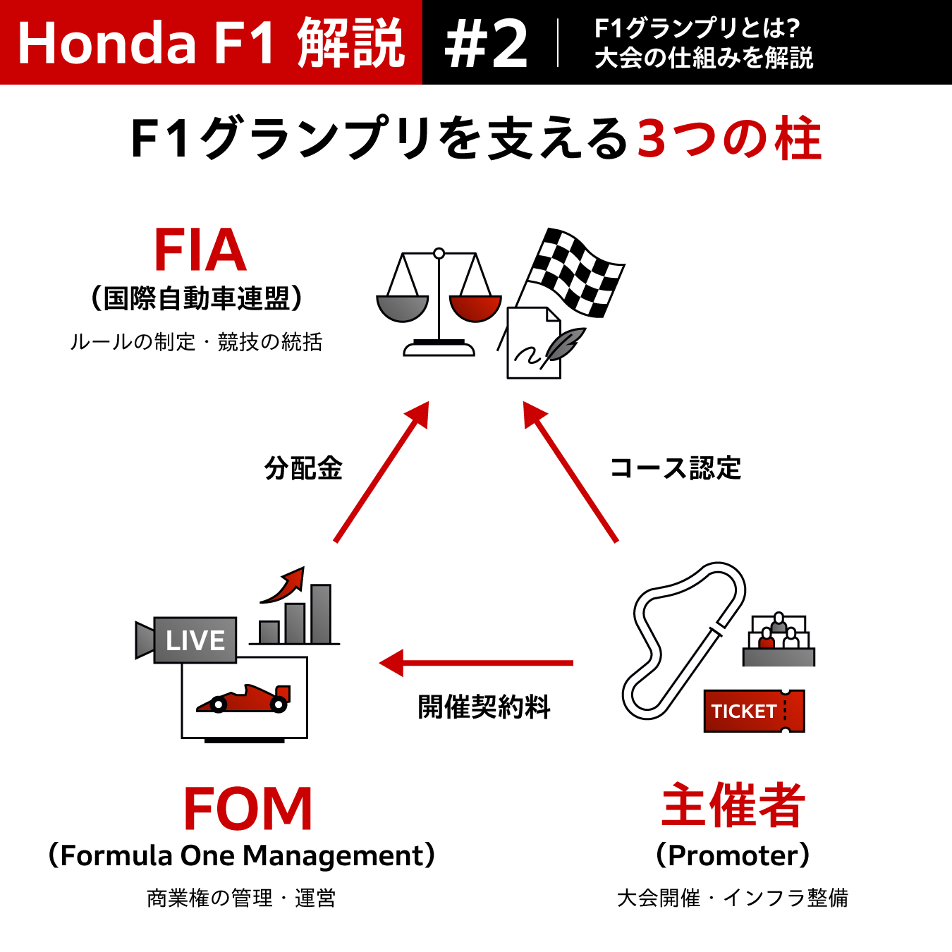 莫大なお金を必要とし、安定的な開催と運営を継続的に行えるシステムとして、この三者がF1開催の重要な役割を担っています。
