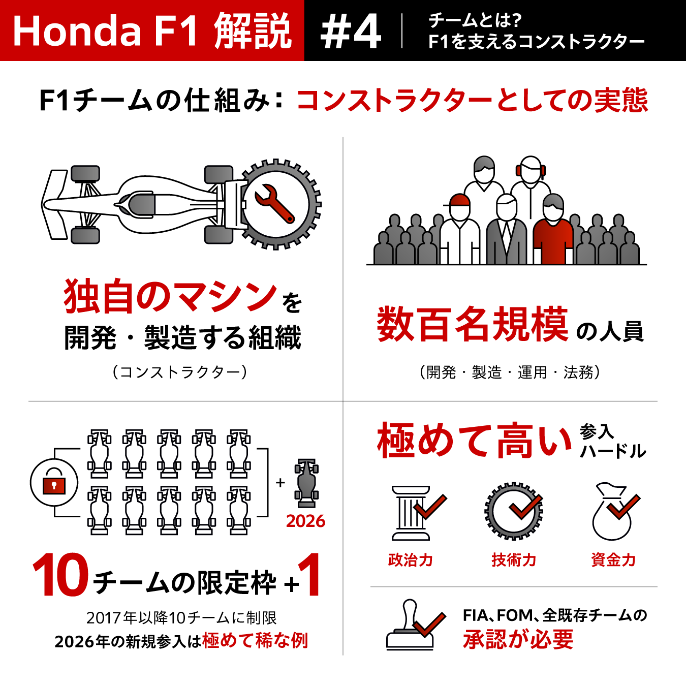 F1に参加するチームはコンストラクターでなければなりません。コンストラクターとは、独自の技術開発により、独自のマシン(車体)を製造する組織であることがルール上定められています。