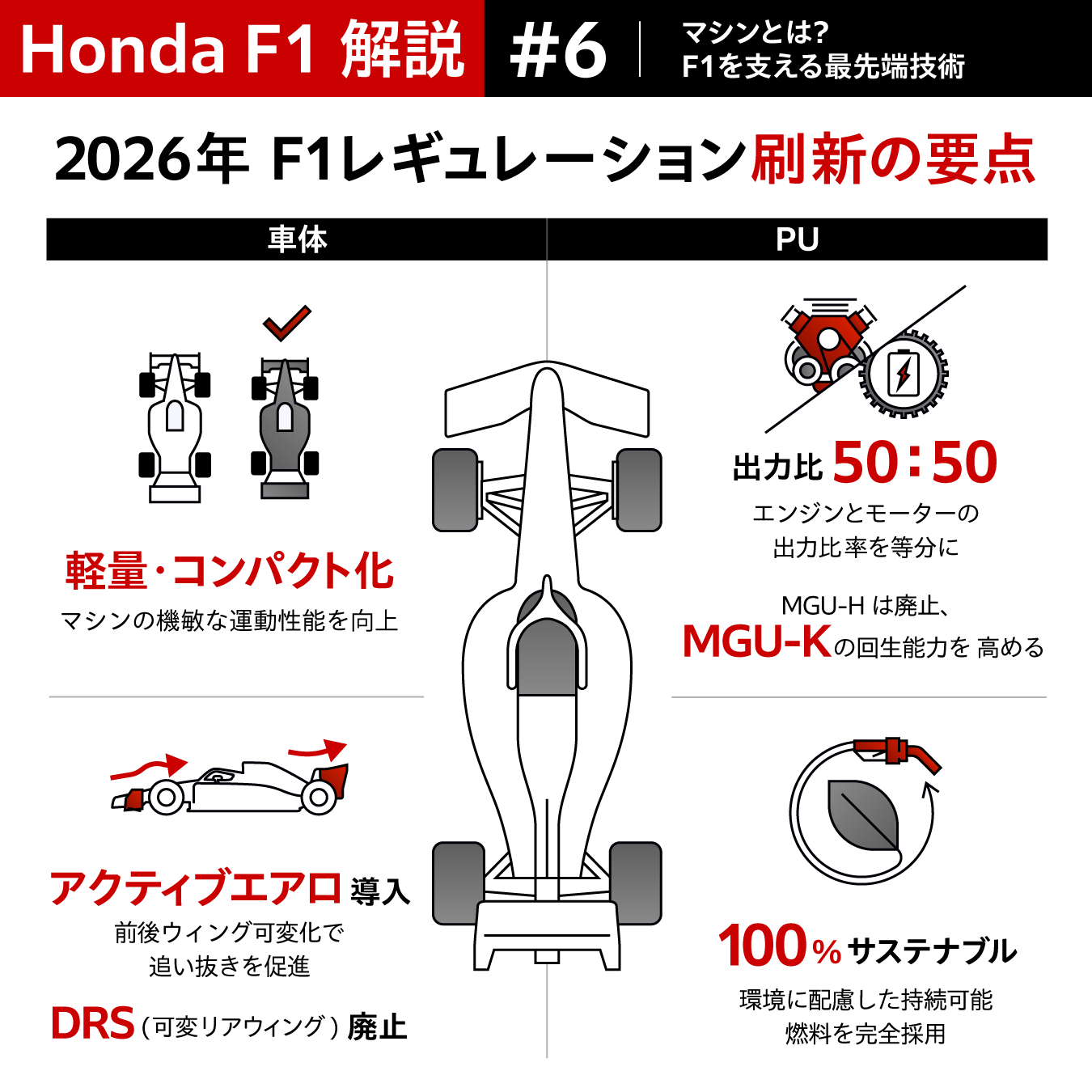 などが挙げられます。詳細は2026年レギュレーションの項目を参照ください。