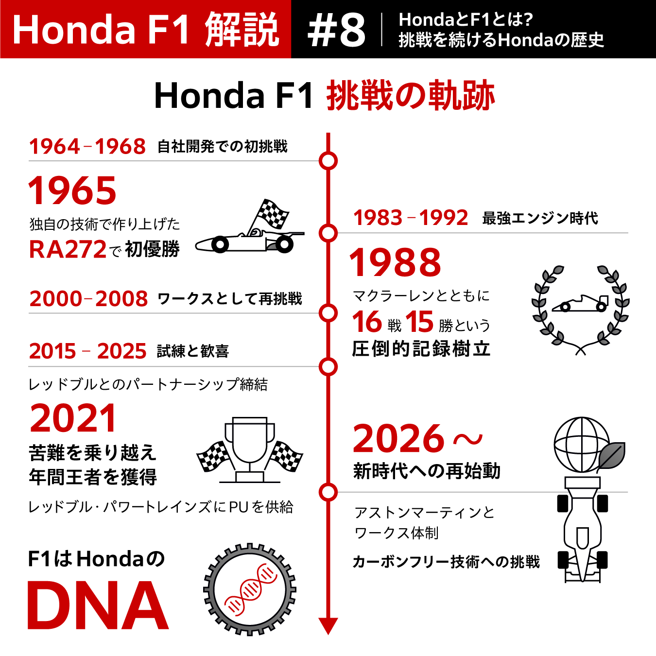 HondaのF1史は、撤退と再開の繰り返しだった。その時々の環境や状況によって合理的判断で活動を辞め、それでも情熱は保ち続け、機を見てその発露として再開を決める。HondaがF1活動に情熱を燃やす理由は「世界最高峰への技術的挑戦」「困難に立ち向かい高い壁を乗り越える技術者の育成」「Hondaのファンとユーザーが抱く信頼と期待に応えるブランド価値の維持」である。そして、それらは勝つことによってのみ得られるという信念がある。一方で「F1が好きで、挑戦することが好き」という根源があり、それが不可能と思える目標に立ち向かうモチベーションとなり、必ず勝利を得て多くのファンとともに感動を共有する、それが「F1はHondaのDNA」と自他ともに認める信条なのである。