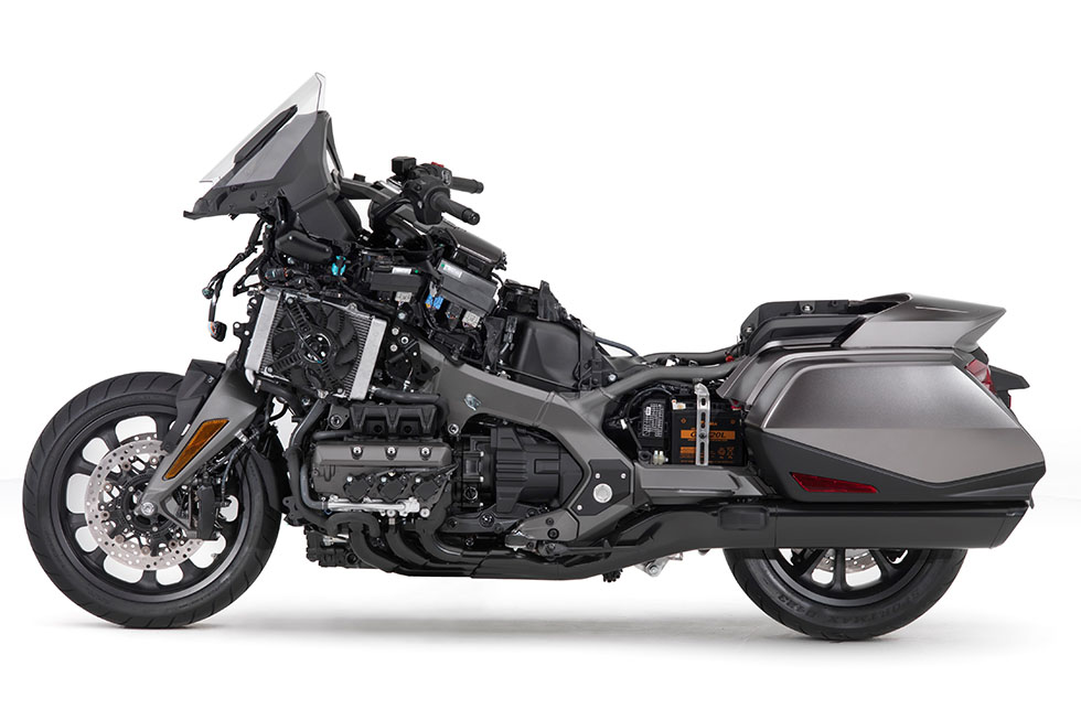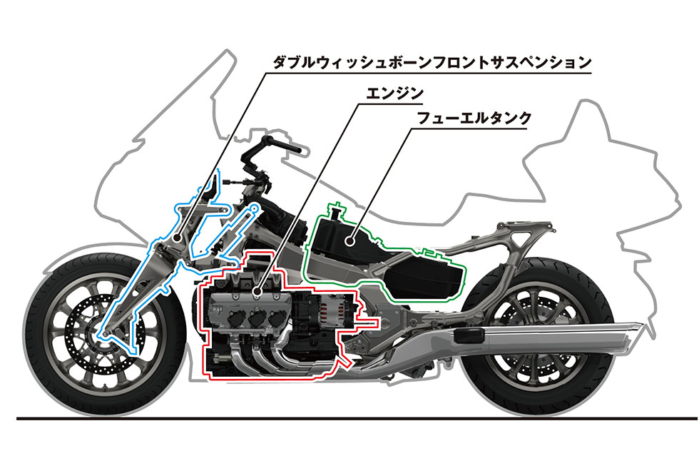 車体とパワーユニットで革新的な軽量化を図ることで、車両重量は従来のGold WingとGold Wing Tourの比較では38kgもの軽量を達成したのです。