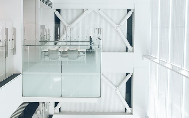 社内にはいくつか会議室がありますが、こちらは吹き抜けの空間の中にある、開放的な会議室。社内ミーティングや相談事などで使用します。