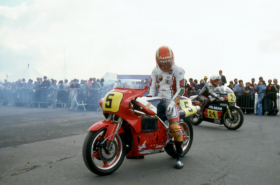 デビュー戦を迎えたNR500と、それに跨がり集中力を高めている片山敬済(かたやま たかずみ)。1979年イギリスGPのプラクティス出走前の一枚。(Photo/Honda)