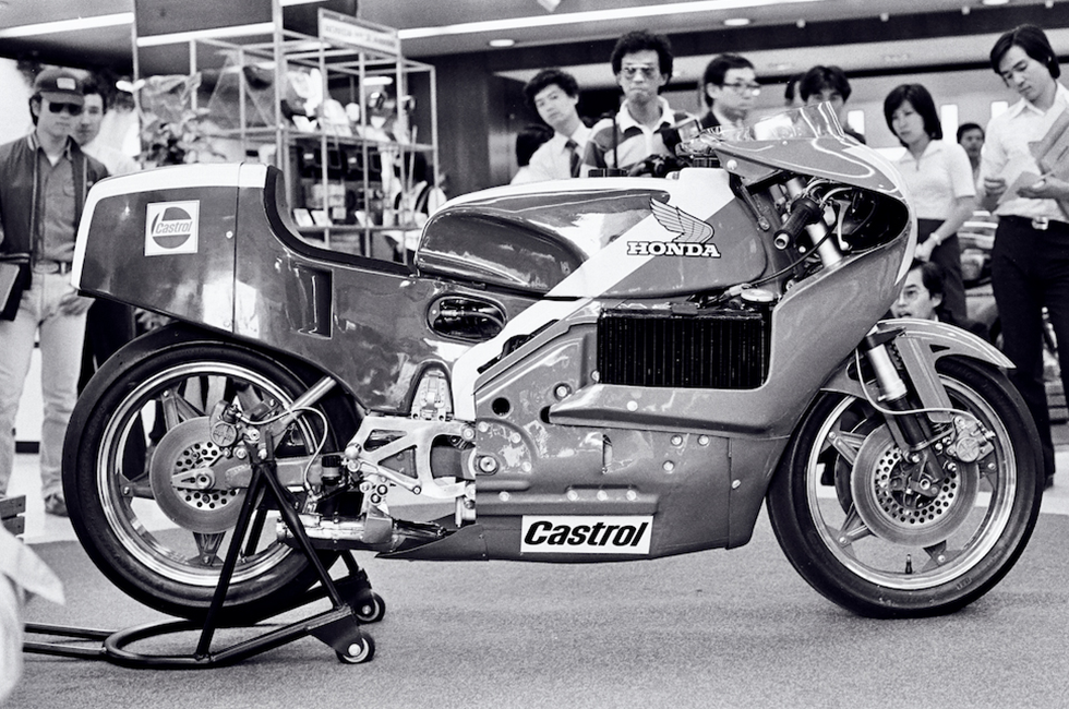 1979年6月7日にホンダが開催した記者発表会で展示された初代NR500(NR1)。まだテストコースしか走っていなかった段階であり、8月12日のデビュー戦イギリスGPに持ち込んだ仕様とは異なる形状のカウルを装着していた。(Photo/Honda)