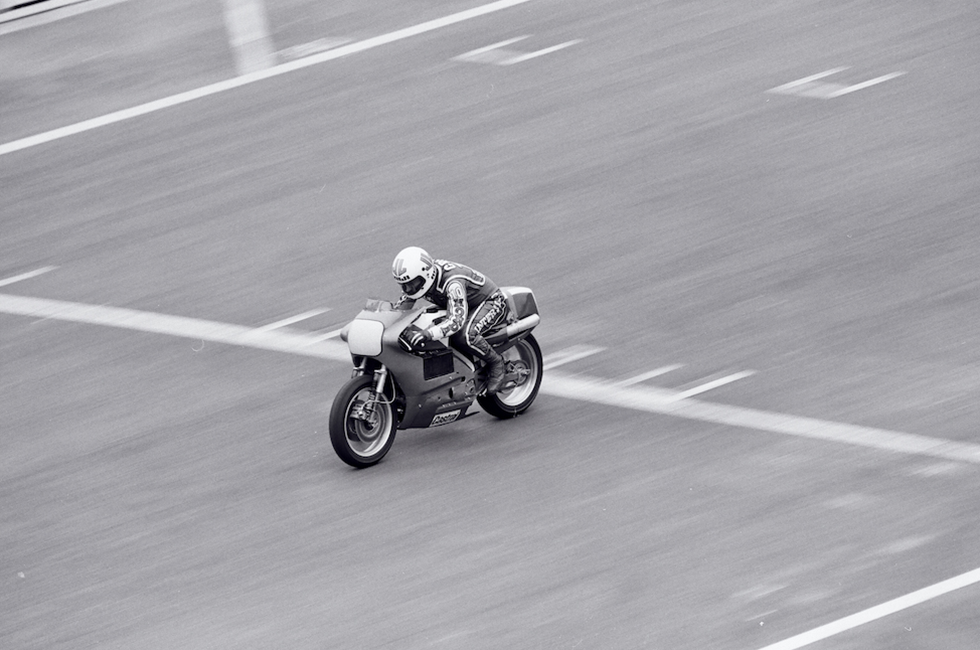 鈴鹿テストを走る NR1。そのサウンドは四輪のV型8気筒レーシングエンジンのものに近い、凄みのある音であった。写真のライダーはグラント。彼はイギリス国内のレースでの活躍が知られたライダーで、当時はホンダ・ブリテンの契約。そのレーシングチームを率いていたのは、ホンダが世界グランプリ活動の欧州拠点としてイギリスに設立したHIRCOのマネージャーでもあったジェラルド・デビソンで、彼の推挙によってグラントがNR500のデビューを担うライダーのひとりとなった。(Photo/Honda)