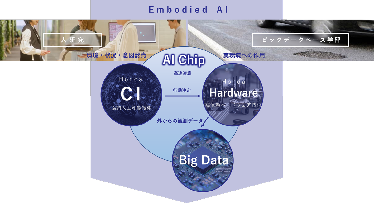 Hondaが独自に開発している協調人工知能「Honda CI(Cooperative Intelligence)」は、人とAI、そしてAI同士が互いの意図を理解し合いながら、共に学習し、成長していく仕組みです。