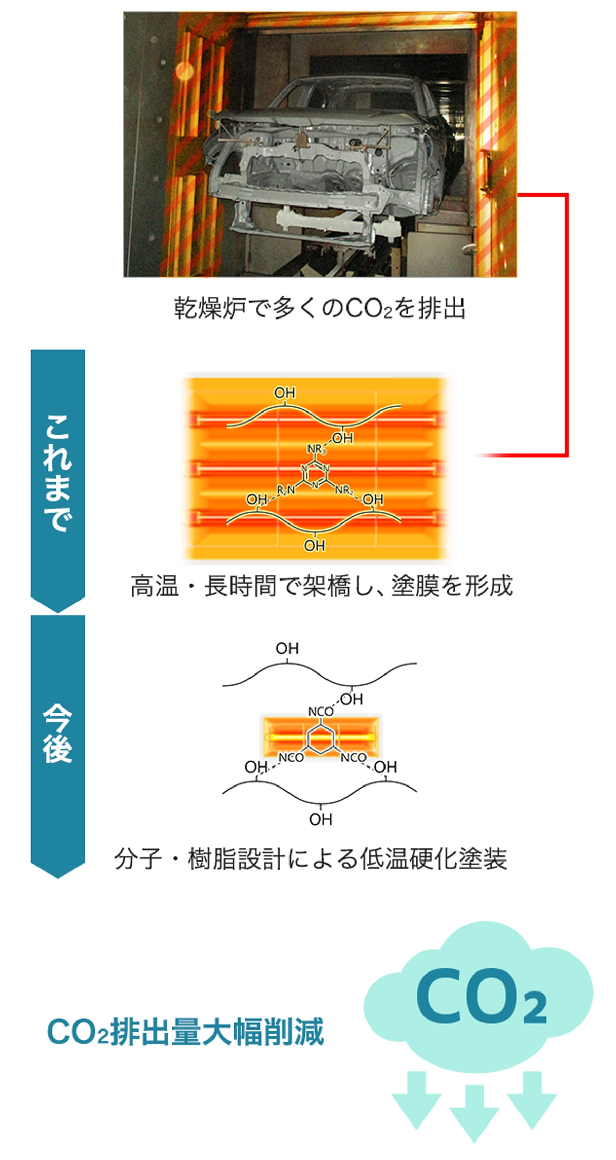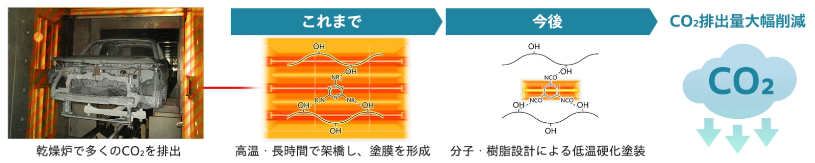 自動車の製造において、塗料や接着剤は乾燥炉で加熱して硬化させることで高い品質を実現してきましたが、この工程は多くのエネルギーを使用するためCO2排出量が課題となります。低エネルギーで硬化する材料技術により製造時のCO2排出量を削減します。