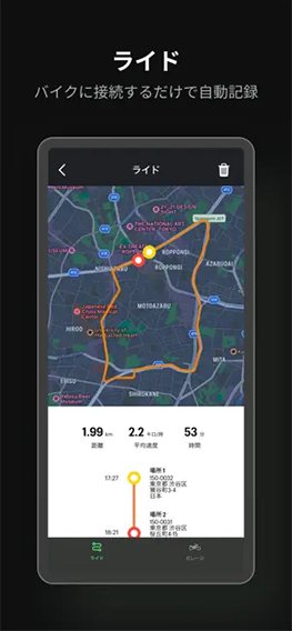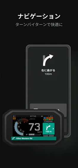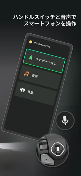 本アプリは、バイクとスマートフォンをBluetoothで接続することで、乗車中であってもスマートフォンの画面を操作することなく(ハンズフリー)、ハンドルスイッチを介して、ナビゲーション(Turn-by-Turn)、音楽の機能にシンプルかつ簡単に操作できるようになります。