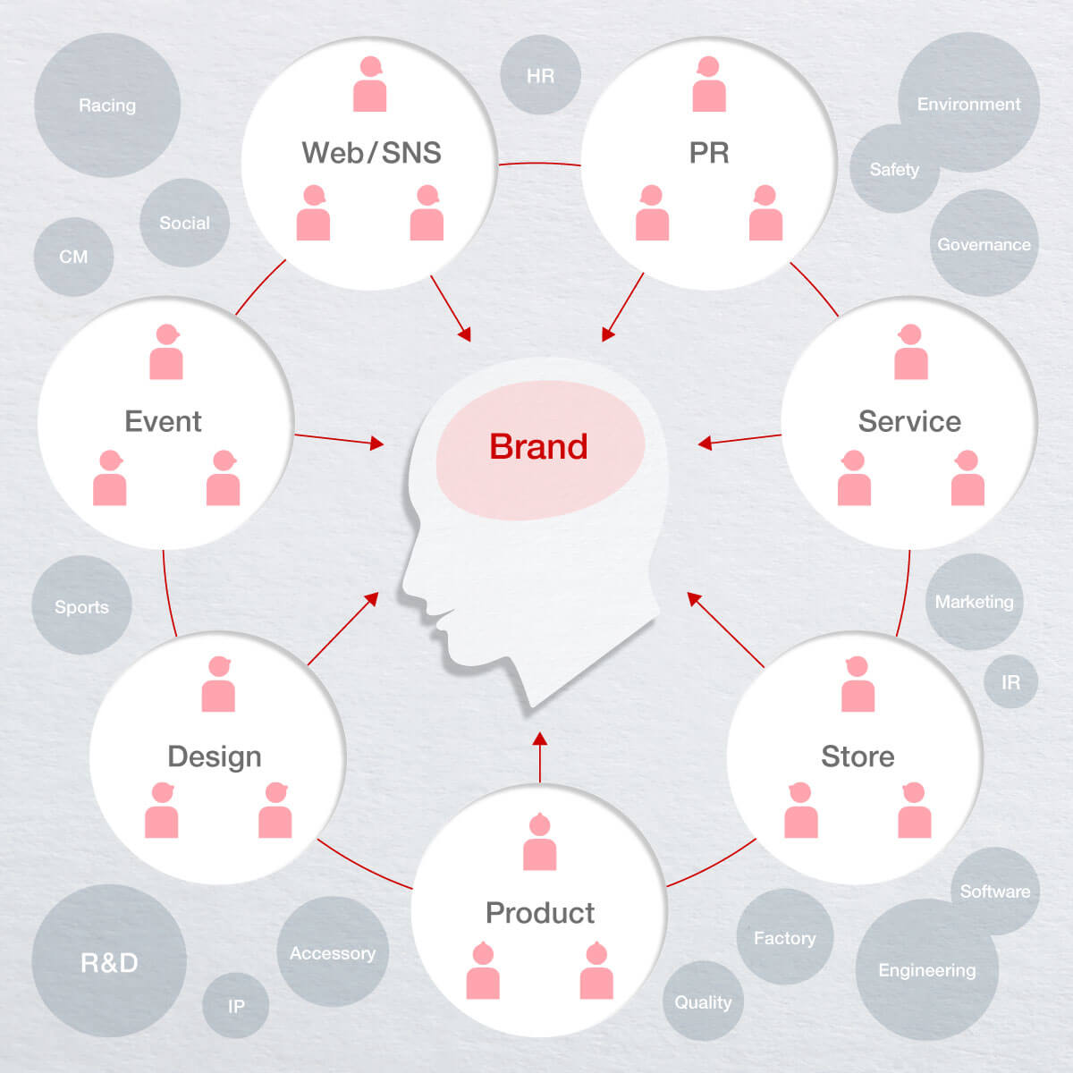 Hondaブランドは、これまで積み上げてきた歴史と、これから行おうとしている活動や製品・サービスの提供などの総体によって、人々の頭の「印象・認知」となって形作られています。