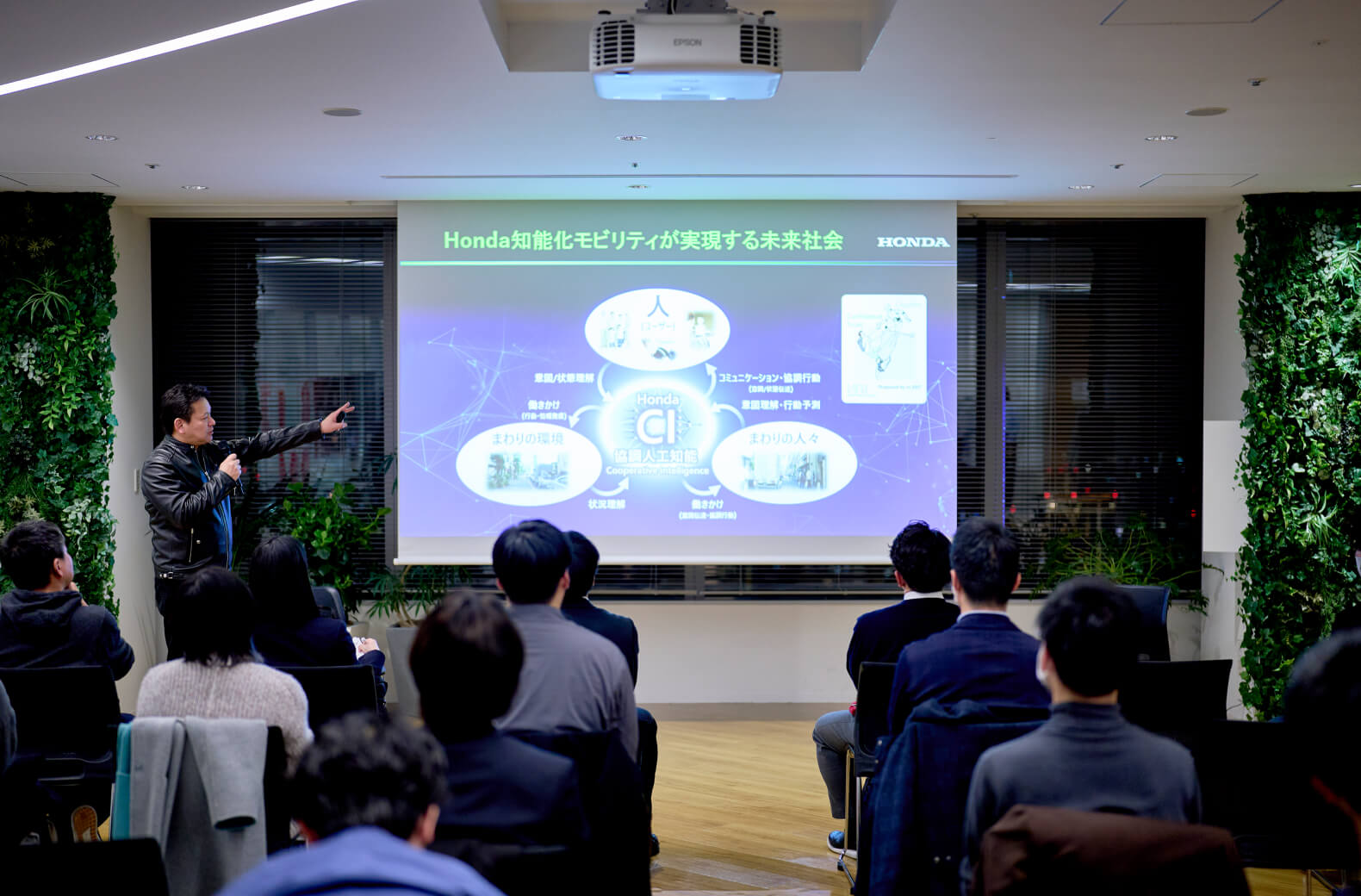 参加したのは、完成車メーカーのソフトウェアエンジニア、運転に関するAIの研究開発を行う研究者や学生、都市計画などに携わる人など。まずはHondaのメンバーから、議論したい社会課題とその課題に向けた取り組み、取り組みを支える技術について紹介がありました。