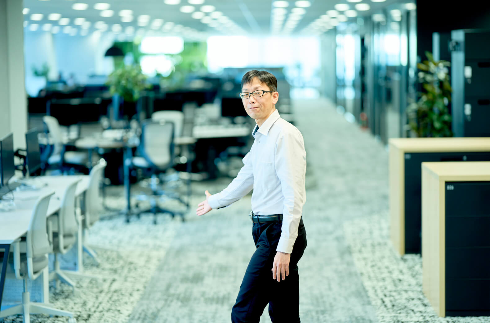 私は、会議や集中力が必要な仕事が続いた後などは、オフィスを一周できる通路をよく歩いています。体もほぐれますし、知っている人を見かけると話しかけたくなります。スペースにほどよくゆとりがあるので、気軽に話しかけられるんですよね」