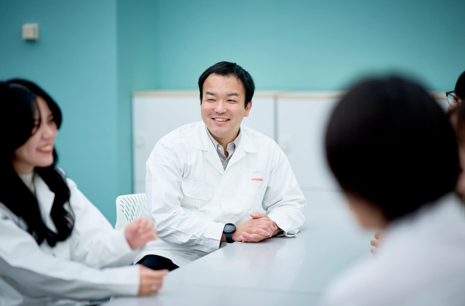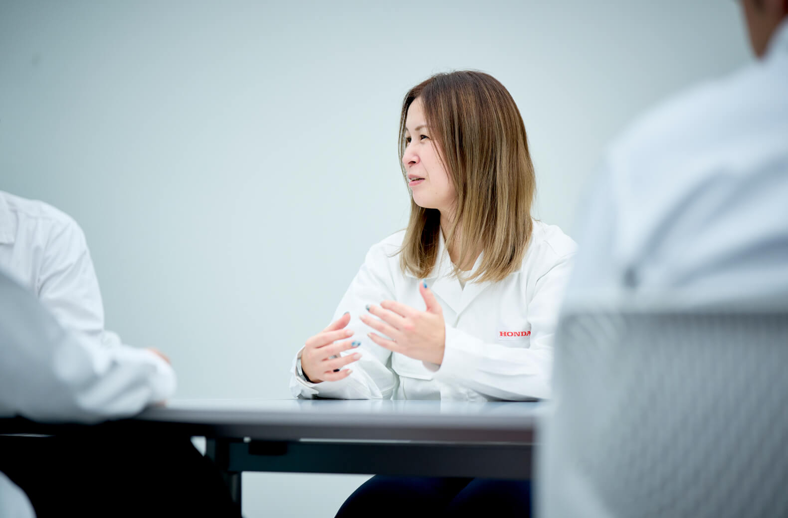 住岡、辻村、紺谷の3人は先進技術研究所の所属。ホンダコライドンにも使われているバイクの自立制御機能や歩行アシスト装置の研究開発などに取り組んでいます。