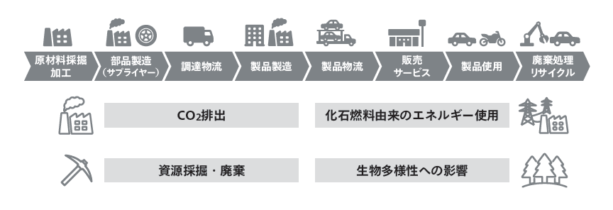 課題達成のためには企業活動を製品ライフサイクルに合わせた各工程に分けて、それぞれの環境負荷を考えることが重要です。