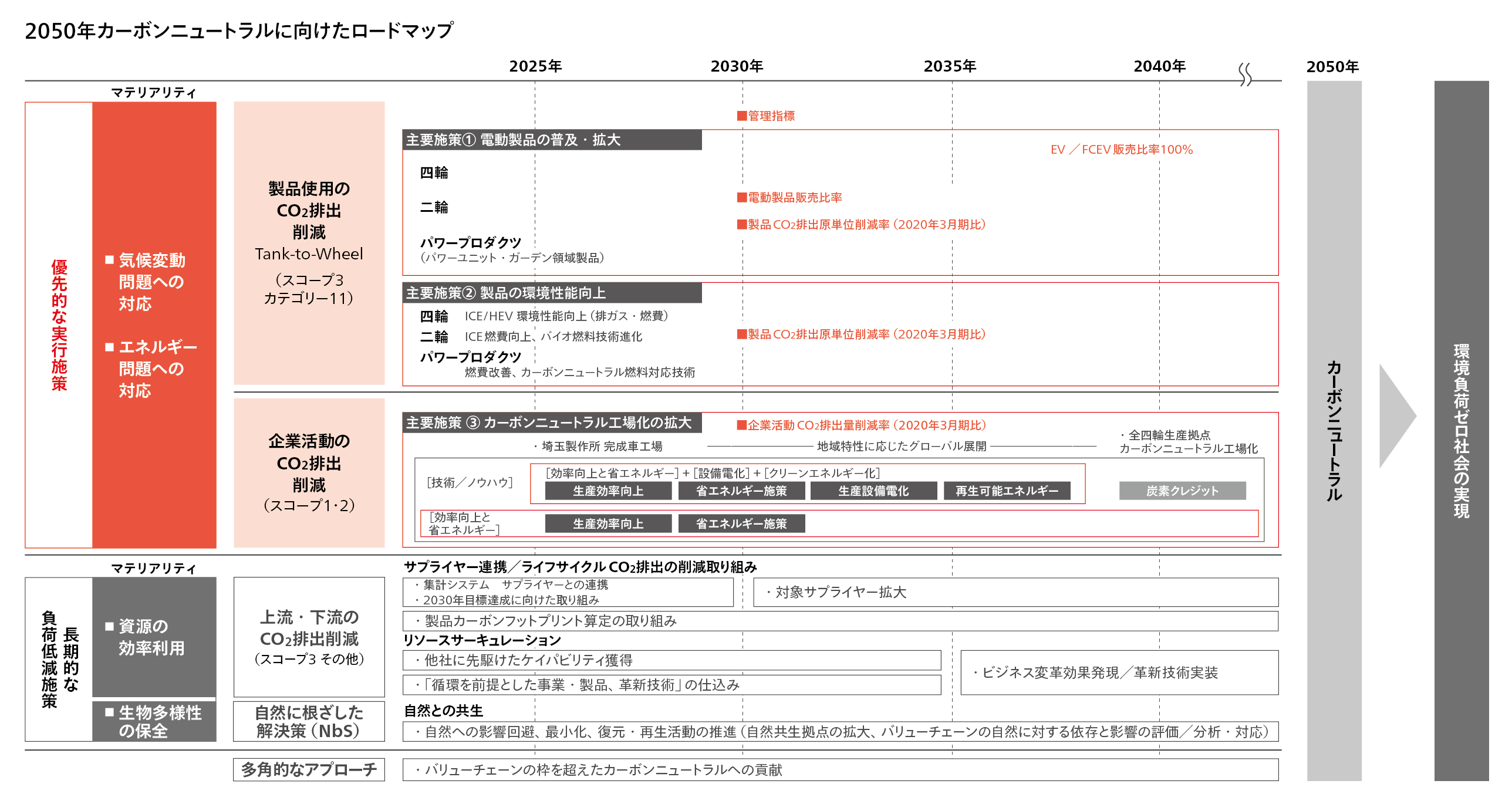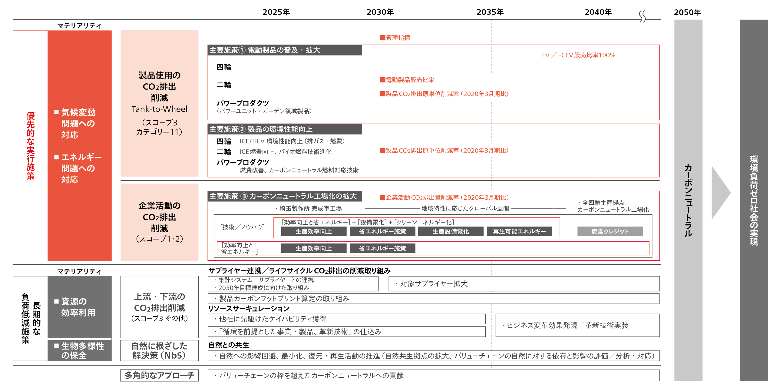 Honda は、ライフサイクル全体での「2050 年カーボンニュートラル」に向けて4つのマテリアリティのうち、