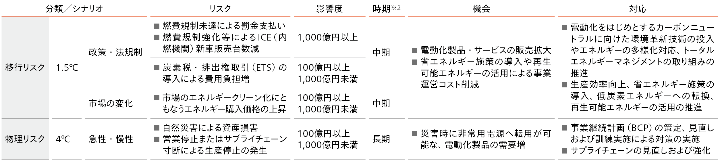 シナリオ分析では、TCFD提言の分類に沿って、気候変動関連リスクと機会を検討し、シナリオ下における中長期の財務影響度を可能な限り定量化し、評価・考察しました。なお、シナリオ分析は二輪・四輪・パワープロダクツ事業を対象としています。