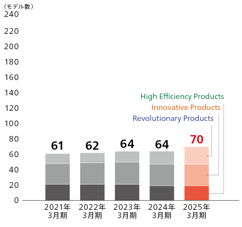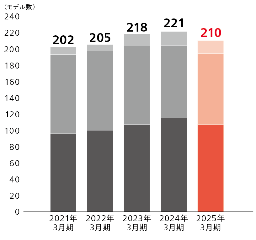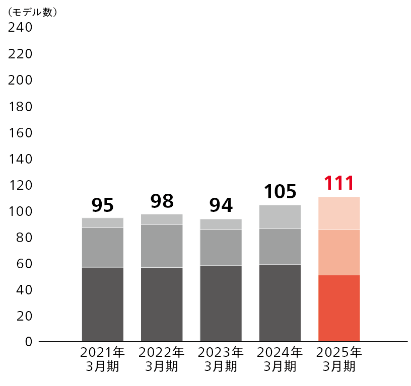 Honda は、2011 年に「Honda環境性能基準(HEPS)」を制定し、運用ガイドラインを定めて、継続的に取り組みを行っており、各事業領域において2024 年3月期のHEPS 適合モデル数は増加傾向にあり、内燃機関搭載製品の効率向上などが着実に進んでいると考えています。