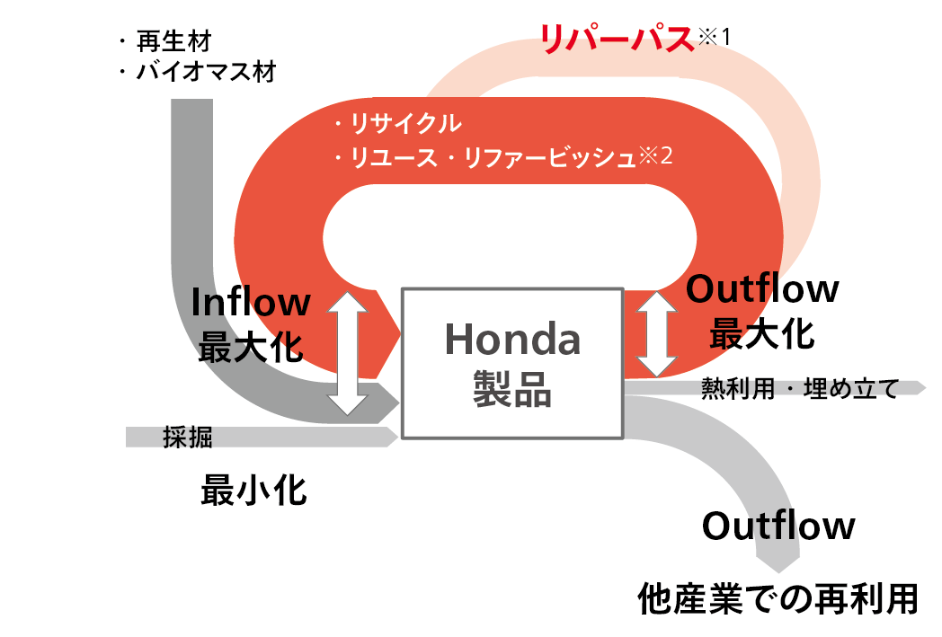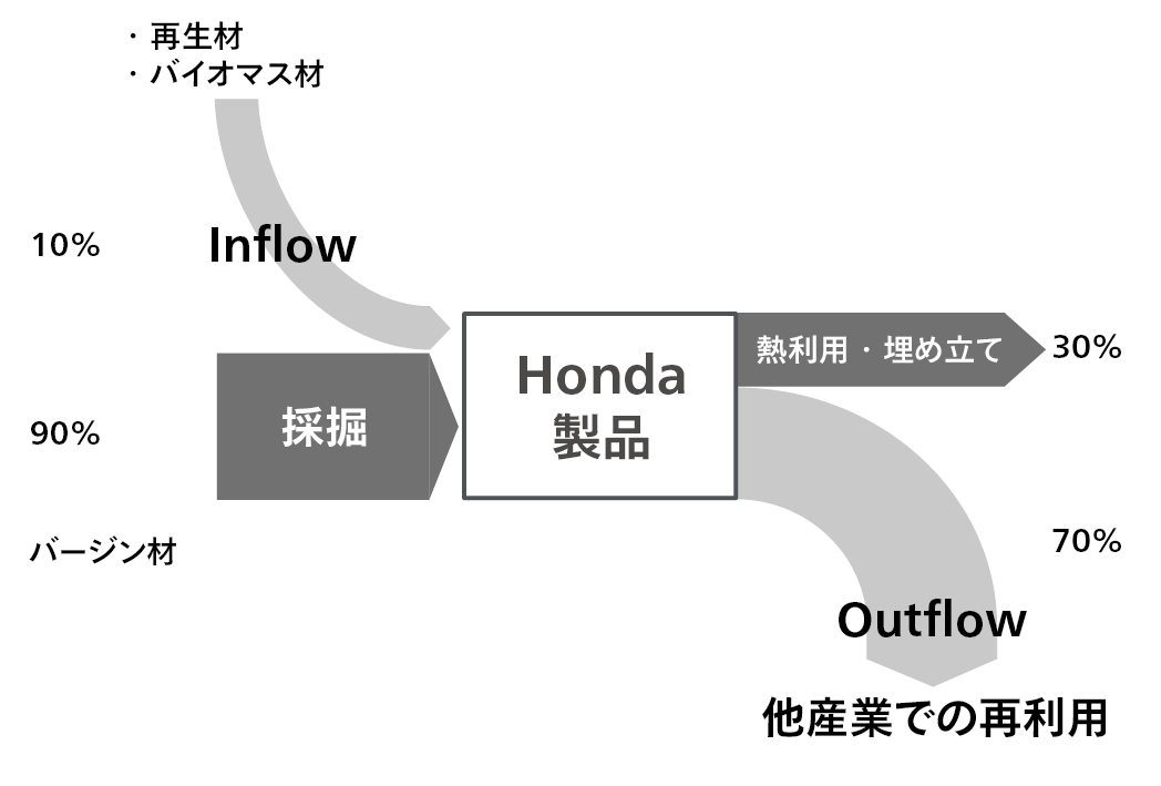 Inflow/Outflowの最大化により、将来の次世代モデルにおいて再生材・バイオマス材使用率50%へチャレンジしています。