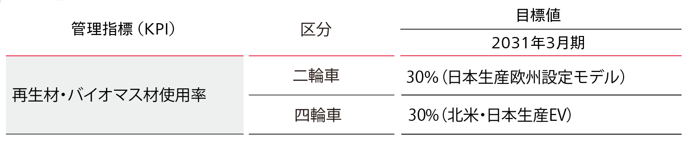 2031年3月期に二輪では日本で生産する欧州設定モデル、四輪では北米および日本で生産するEVにおいてそれぞれ30%を目指します。