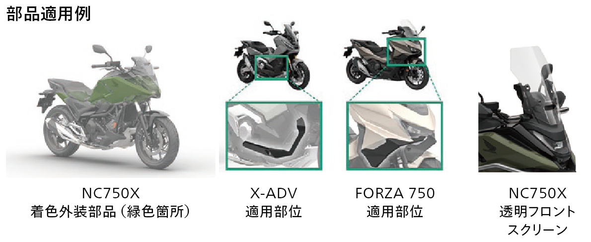 バイオエンジニアリングプラスチック“DURABIOTM”※2の適用拡大の取り組みとして、二輪車として初めて、2024 年に販売したNCシリーズの外装着色部品に適用しました。