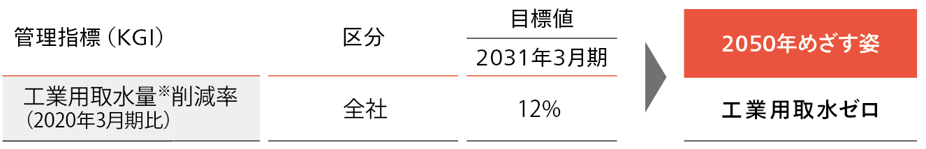 より本質的な課題解決に向けて、2050年のありたき姿と連動した中間目標として、2031年3月期までに工業用取水量を12%削減する新たな KGI と目標値を設定しました。