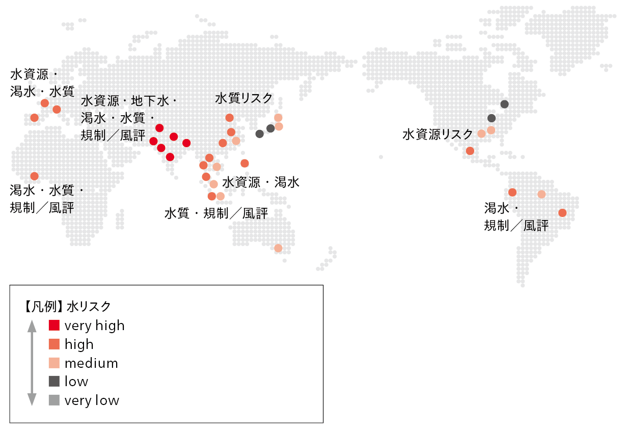 水は、地域や季節などによって偏在する資源であり、水の使用量の多い製造拠点においては、「AQUEDUCT」や「Water Risk Filter」などの評価指標を用いて拠点地域における「水資源」「地下水」「渇水」「水質」「規制/風評」などのリスクの検証・特定を行っており、リスクに応じた取り組みを推進しています。
