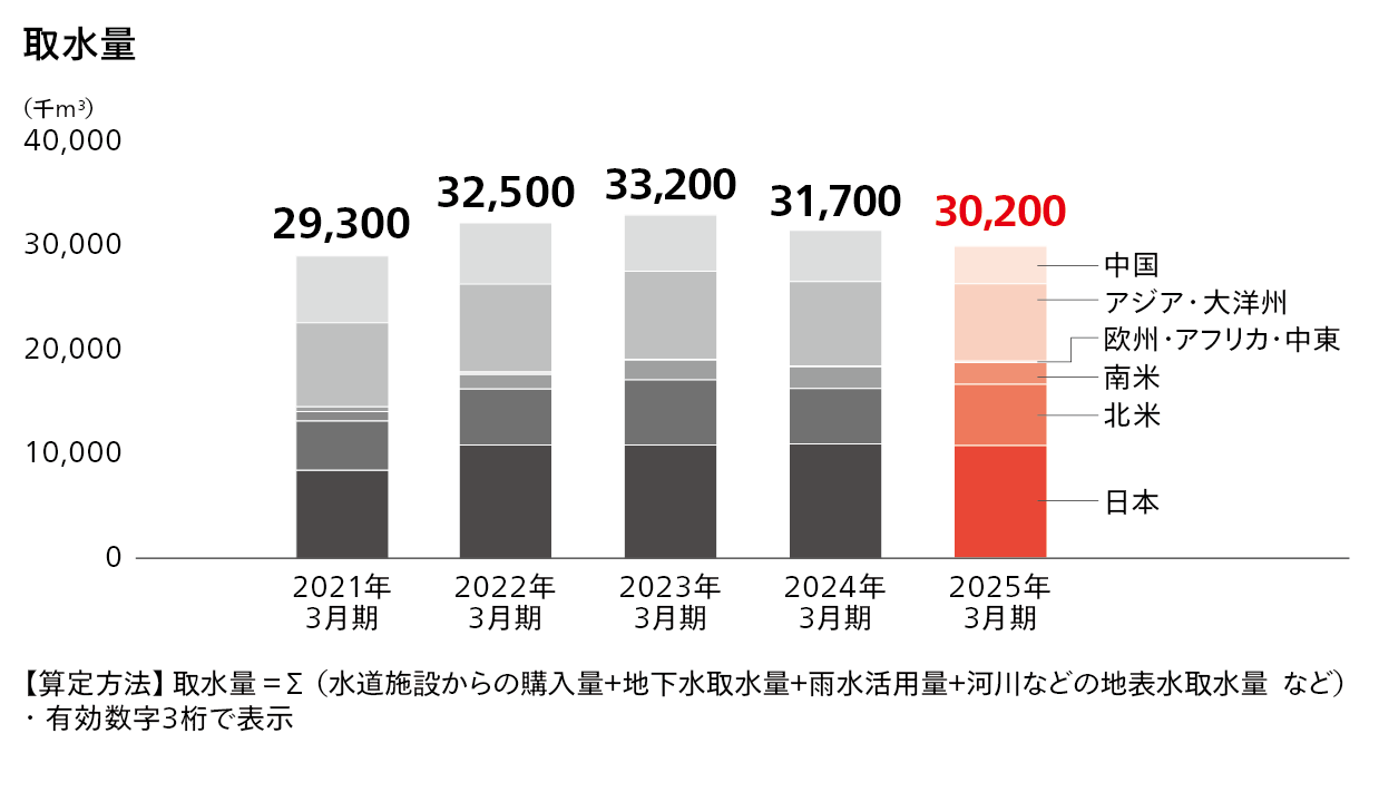 また、事業に影響を及ぼす供給リスクや地域社会に影響を及ぼす枯渇リスクを視野に入れ、すべての企業活動における取水総量の削減をめざしていきます。