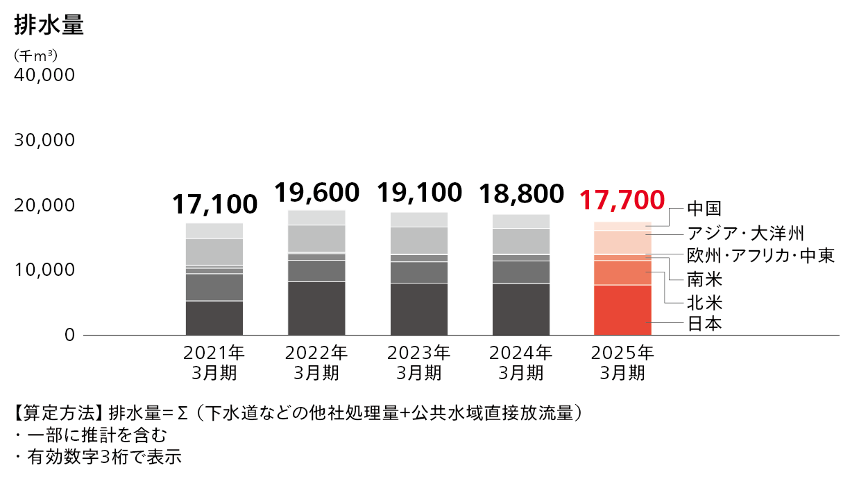 排水についても、各国の法規に従った排水処理や処理水の放流を行っているため、排水によって影響を受ける水源はなく、排水量の管理を行っています。