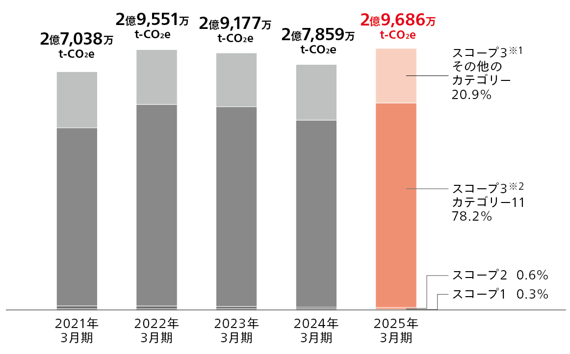 - スコープ3 カテゴリー11について、2021年3月期まではIEA SMP Modelで、2022年3月期からは、IEA Mobility Model(MoMo)で集計しています。また、2023年3月期より、一部算出条件を変更しています。