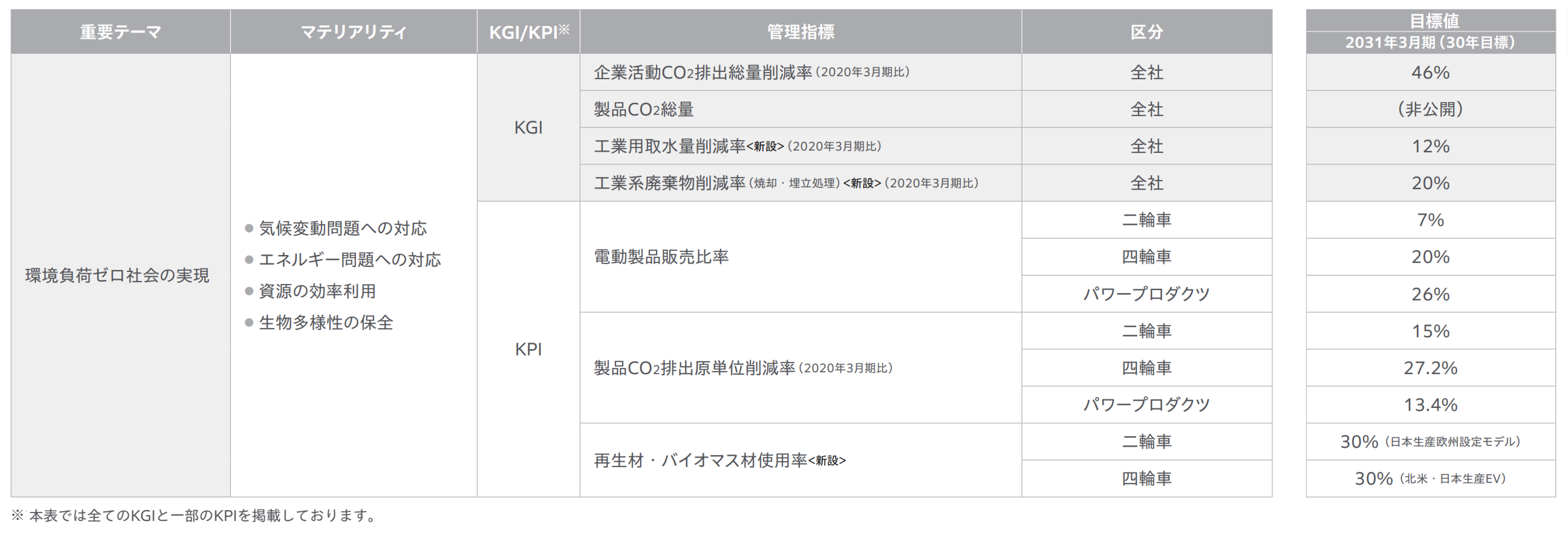 Hondaでは「環境負荷ゼロ社会の実現」に向けて、取締役会が監督責任を有するKGI や経営会議が執行責任を有するKPI は、取締役会や経営会議が進捗を定期的にモニタリングすることで、経営ガバナンスの強化を図っています。財務指標および非財務指標に連動した役員報酬制度については有価証券報告書「4 コーポレート・ガバナンスの状況等(4)役員の報酬等」をご参照ください。