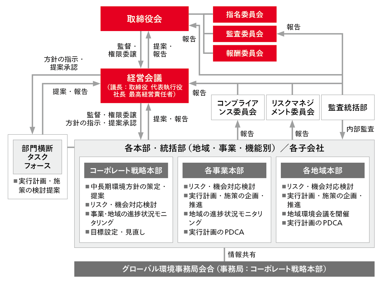 各本部、統括部や各子会社は、全社の長期経営方針や中期経営計画に基づき、実行計画・施策を企画・推進し、重要事項については経営会議で適宜、報告・承認されています。各事業本部や各地域本部では、「グローバル環境事務局会合(事務局:コーポレート戦略本部)」で共有される情報をもとに、グローバルの中長期環境方針を踏まえ、実行計画を策定し、施策を推進しています。各地域本部では、「地域環境会議」を開催し、地域本部内でのPDCAを推進しています。各事業本部では、地域の進捗状況をモニタリングし、事業本部内でのPDCAを推進しています。コーポレート戦略本部では各事業本部や各地域本部での進捗状況をモニタリングし、必要に応じて中長期環境方針や目標の見直しを検討します。なお、重要事項は経営会議にて報告・承認され、取締役会にて報告・決議されています。また、気候変動問題への対応など、部門をまたぐ重要課題については「部門横断タスクフォース」を組成し、実行計画・施策の検討提案を適宜行い、重要事項については経営会議で報告・承認されています。