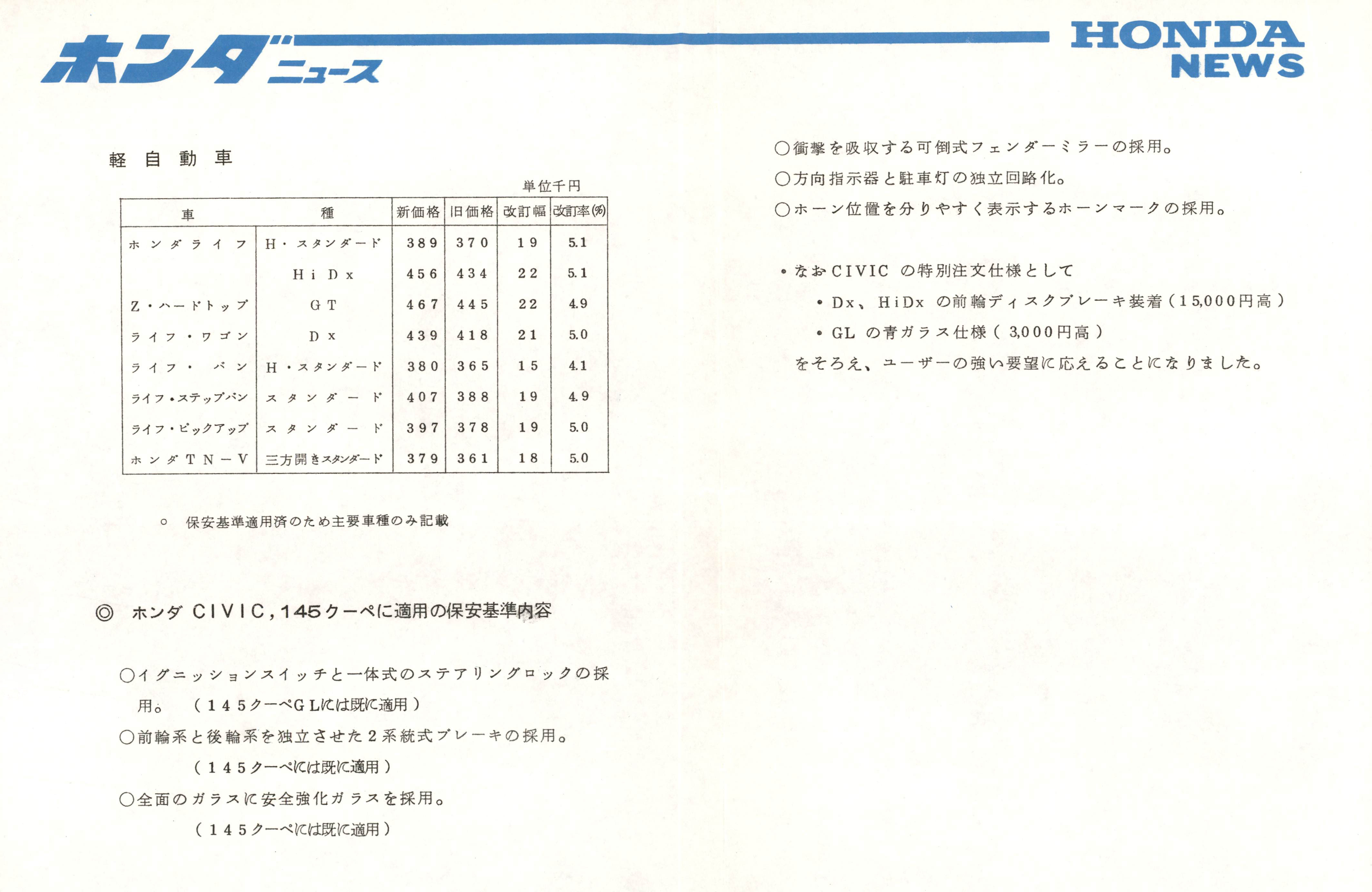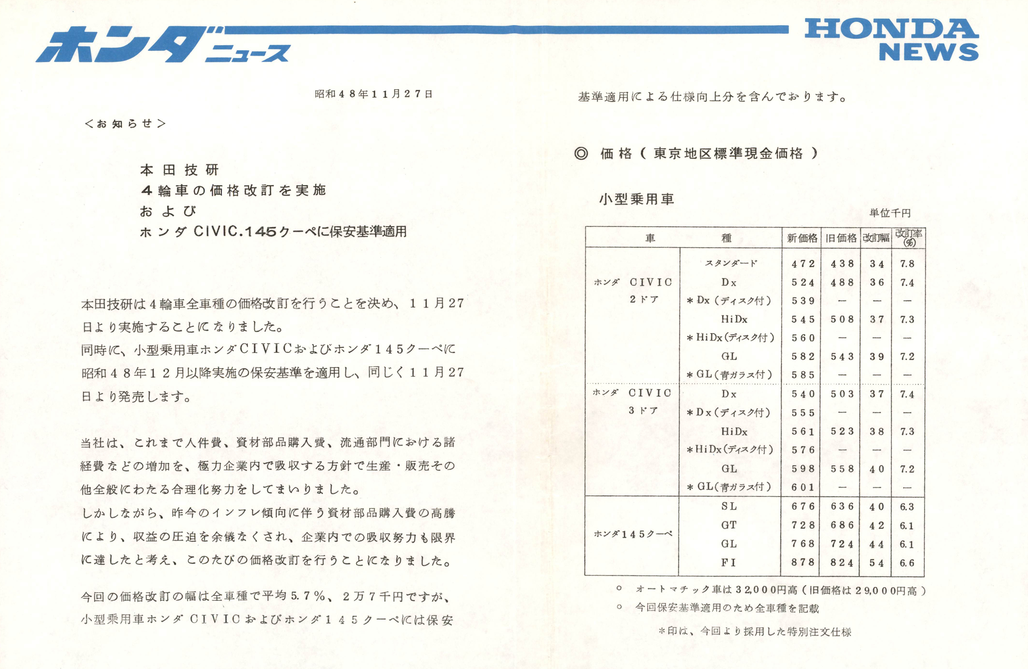�\ ::,4z:�N���a 48�N 11�� 27�������m�点���{�c�Z��4 �֎Ԃ̉��i���������{������z���_ CIVIC.146�N�[�y�ɕۈ���K�p�{�c�Z���� 4�֎ԑS�Ԏ�̉��i�������s�����Ƃ����߁A 11�� 27�������{���邱�ƂɂȂ�܂����B�������A���^��p�ԃz���_ CIVIC����уz���_ 14 5�N�[�y�����a 48�N 12���ȍ~���{�̕ۈ��؏���K�p���A������ 11�� 27����蔭�����܂��B���Ђ́A����܂Ől����A���ޕ��i�w��ႁA���ʕ���ɂ����鏔�o��Ȃǂ̑������A�ɗ͊�Ɠ��ŋz��������j�Ő��Y�E�̔��������S�ʂɂ킽�鍇�����w�͂����Ă܂���܂����B�������Ȃ���A�����̃C���t���X���ɔ������ޕ��i������̍����ɂ��A���v�̈�����]�V�Ȃ�����A��Ɠ��ł̋z���w�͂����E�ɒB�����ƍl���A���̂��т̉��i�������s�����ƂɂȂ�܂����B����̉��i�����̕��͑S�A�Ԏ�ŕ��� 5.7 %�A 2�� 7��~�ł����A���^��p�ԃz���_ CIVIC����уz���_ 14 5�N�[�y�ɂ͕ۈ�HON�H> ANEWS ��K�p�ɂ��d�l���㕪���܂�ł���܂��B�����i�i�����n��W���������i�j���^��p���P�ʐ�~�� �� �V���i �����i �� ���i���X�N���_�[�h 472 438 34 7.8 �z���_ CIVIC Dx 524 488 36 7.4 2�h�A * Dx�i�f�B�X�N�t�j 539 HiDx 545 508 37 7.3 * HiDx�i�f�B�X�N�t�j 5 6 0 GL 582 543 39 7.2 * GL�i�K���X�t�j 585 �D�D ...... �D�D �D ... �D�D�D �D�D�D�D ... ... �z���_ CIVIC Dx 540 503 37 7.4 3 �h�A *Dx�i�f�B�X�N�t�j 555 HiDx 561 523 38 7.3 *HiDx�i�f�B�X�N�t�j 576 GL 598 558 40 7.2 * GL�i�K���X�t�j 601 SL 676 636 40 6.3 GT 728 686 42 6.1 �z���_ 145�N�[�yGL 768 724 44 6.1 FI 878 824 54 6.6 0 �I �[�g�}�`�b�N�Ԃ� 32,000�~���i�����i�� 29,000�~���j0 ����ۈ���K�p�̂��ߑS�Ԏ���L������́A������̗p ���� ���ʒ����d�l�ۃj�^z:�N�y�������P�ʐ�~�� �� �V���i �����i ������ �������i�}�z���_���C �t H �E�X�N���_�[�h 389 370 1 9 5. 1 H i D X 456 434 22 5. 1 Z �E�n�[�h�g�b�v GT 467 445 22 4.9 ���C�t�E���S�� D X 439 418 21 5.0 ���C�t �E �o �� H �E�X�N���_�[�h 380 365 1 5 4.1 ���C�t�E�X�e�b�v�o�� �X�N���_�[ �h 407 388 19 4.9 ���C�t�E�r�b�N�A�b�v �X�N���_�[ �h 397 378 1 9 5.0 �z���_ TN-V �O���J���X�N���_�[�h 379 3 6 1 1 8 5.0 0 �ۈ���K�p�ς̂��ߎ�v�Ԏ�̂L���� �z���_ CIVIC,145�N�[�y�ɓK�p�̕ۈ�����e�Z �C�O�j�b�V�����X�C�b�`�ƈ�̎��̃X�e�A�����O���b�N�̍��p�B (1 4 5�N�[�yGL�܂͊��ɓK�p�j0�O�n �ƌ�n��Ɨ������� 2�n�����v�� �[�L�̗̍p�B(1 4 5�N�[�y�ɂ͊��ɓK�p�j�Z �S�ʂ̃K���X�Ɉ��S�����K���X���̗p�B(1 4 5�N�[�y�ɂ͊��Z�K�p �jHOnD^ NEWS 0�Ռ����z������|���t�F���_�[�~���[�̗̍p�B�Z�����w����ƒ��ԓ��̓Ɨ���H���B�Z�z�[���ʒu��₷���\������z�[���}�[�N�̗̍p�B�E�Ȃ� CIVIC �̓��ʒ����d�l�Ƃ���? Dx�A HiDx �̑O�փf�B�X�N�v���[�L�����i 15,000�~���j? GL �̐K���X�d�l�i 3,000�~���j�����낦�A���[�U�[�̋����v�]�ɉ����邱�Ɣ܂Ȃ�܂����B