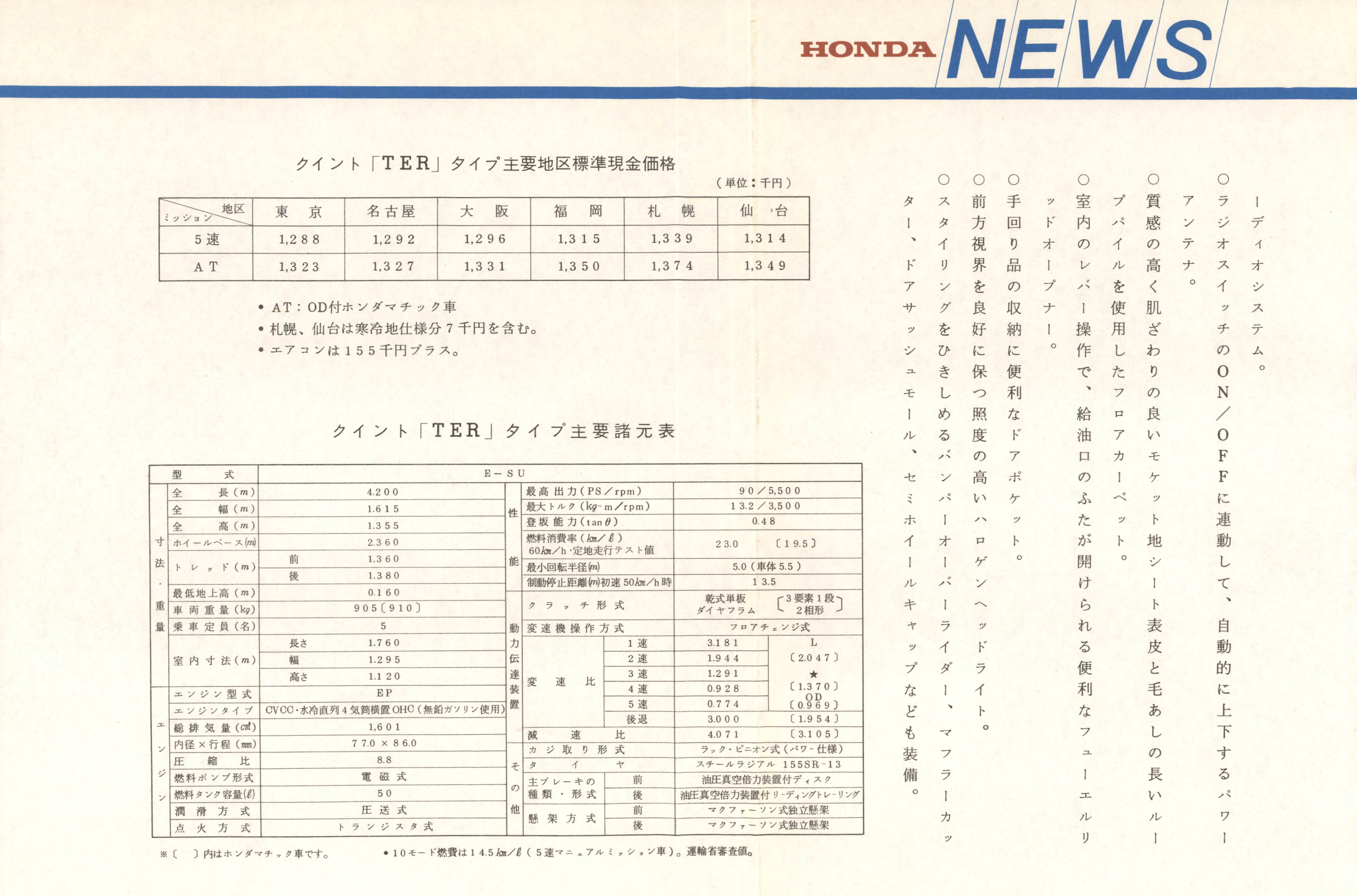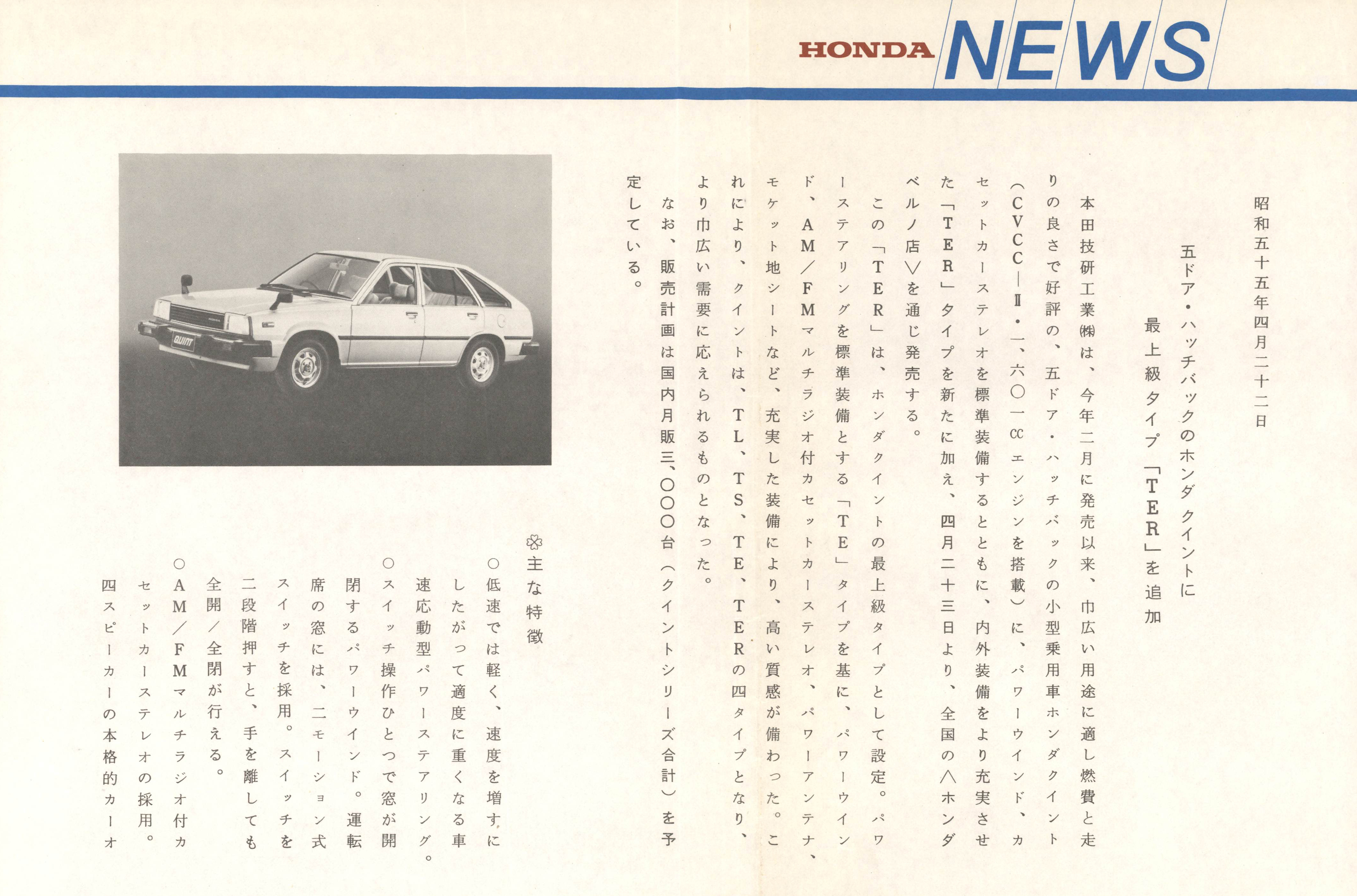 五ドア・ハッチバックのホンダクイントに最上級タイプ「TER」を追加