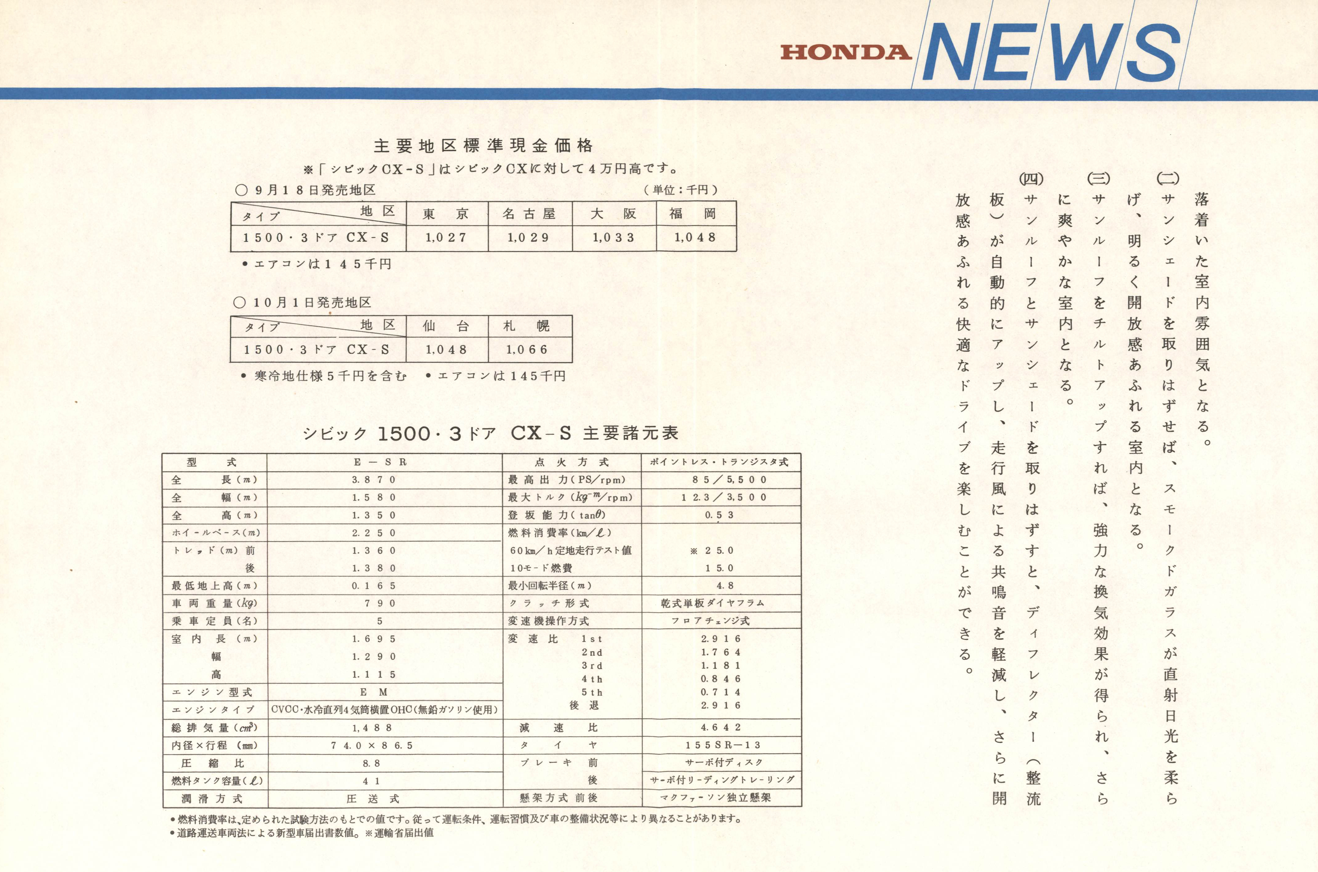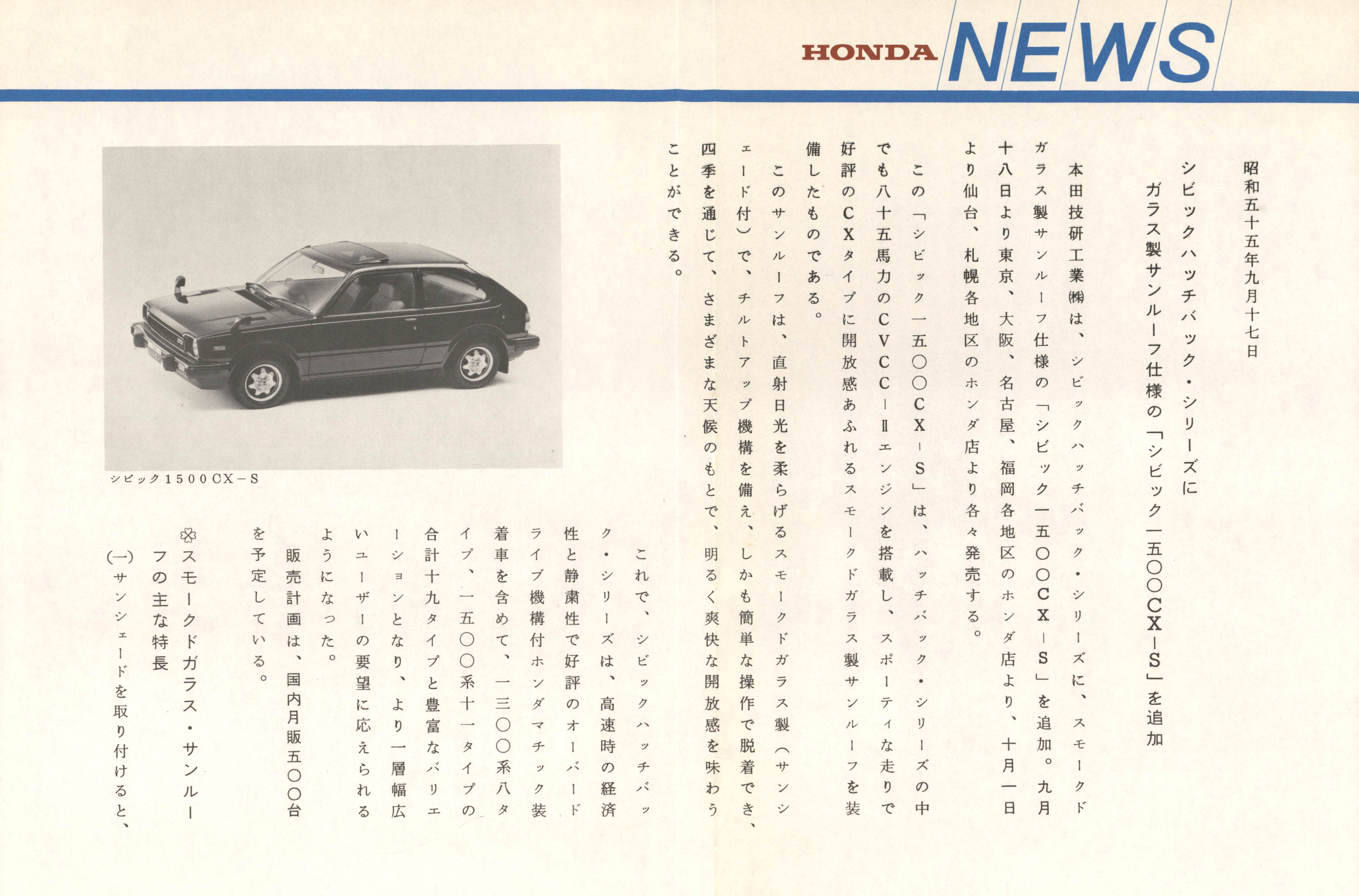 シビックハッチバック・シリーズにガラス製サンルーフ仕様の「シビック一五〇〇CX-S」を追加