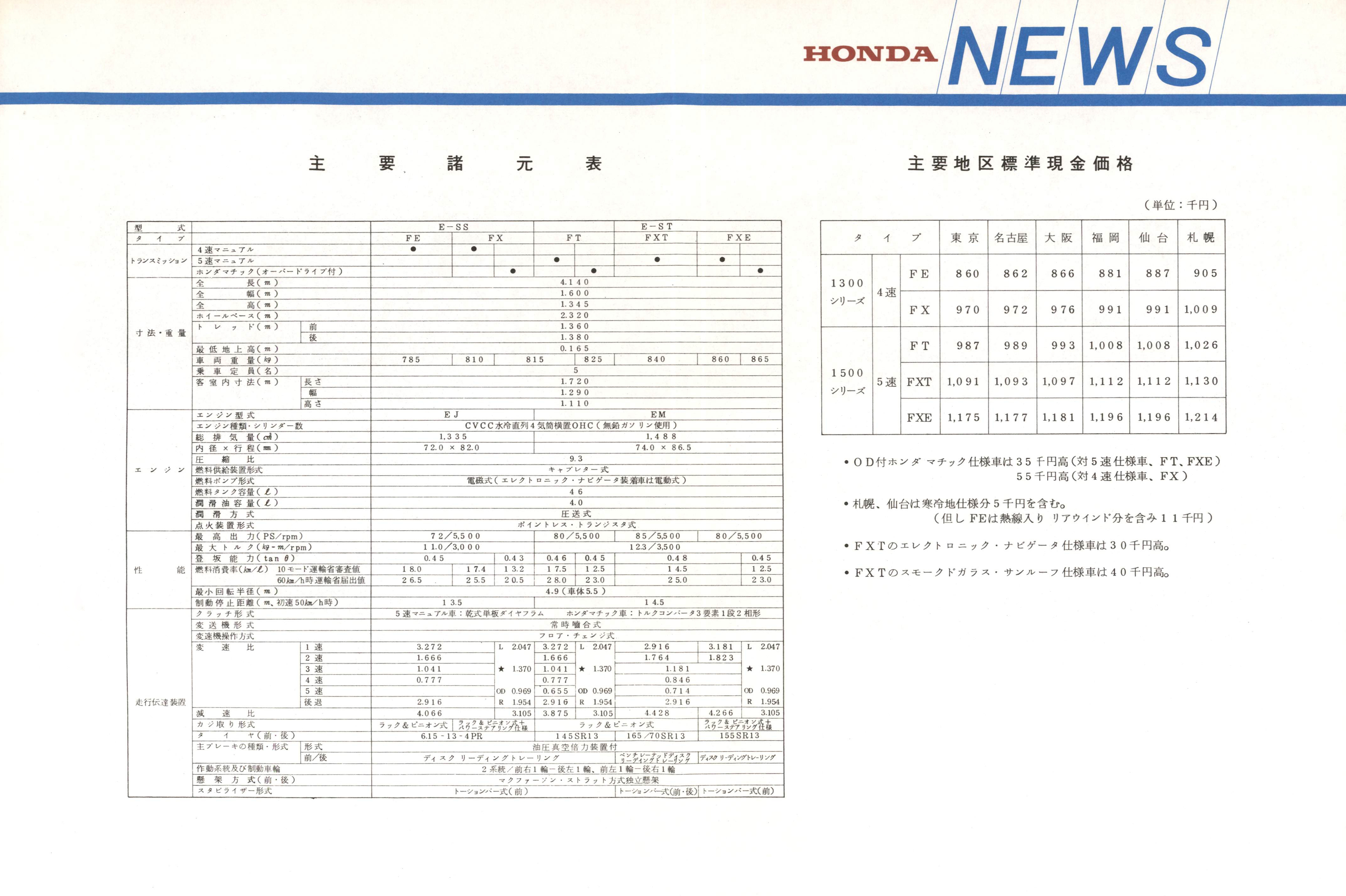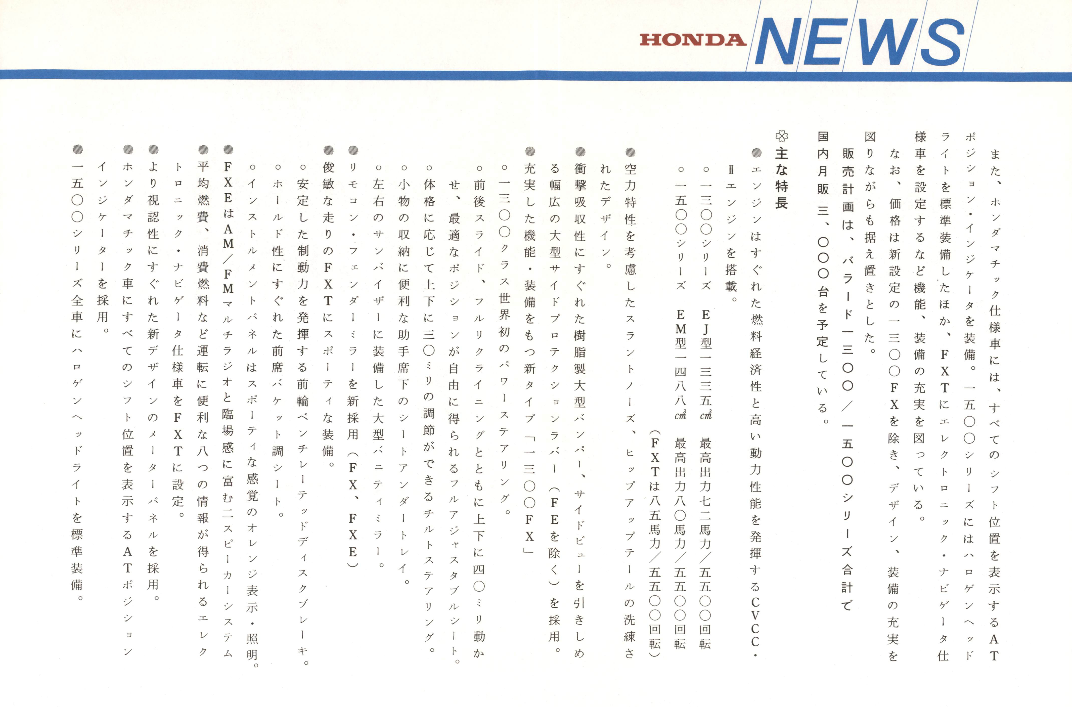 ホンダバラードシリーズ、デザインを一新、機能・装備を充実同時にパワーステアリング装着車「一三〇〇FX」を追加し発売