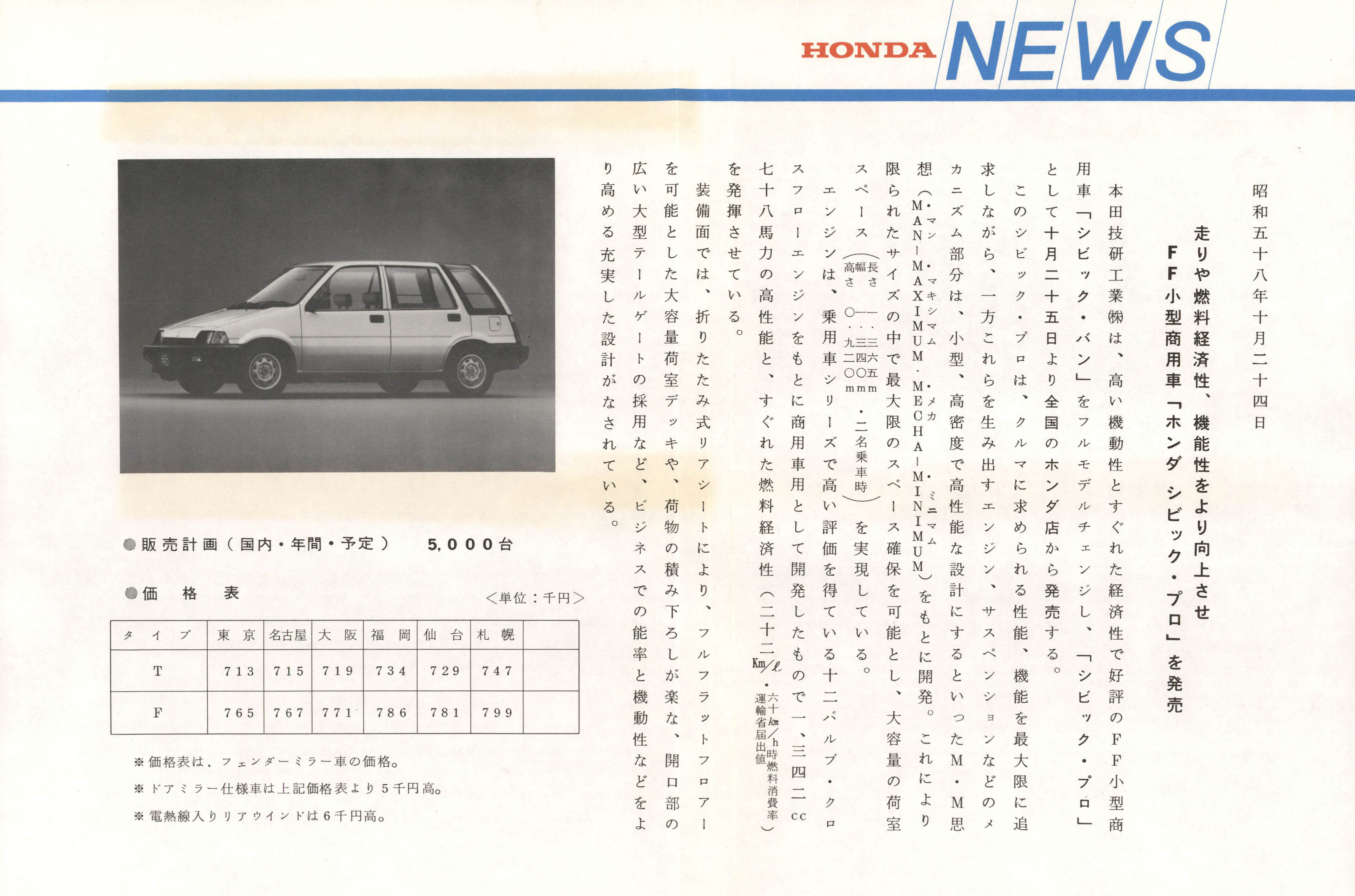 走りや燃料経済性、機能性をより向上させFF小型商用車「ホンダシビック・プロ」を発売
