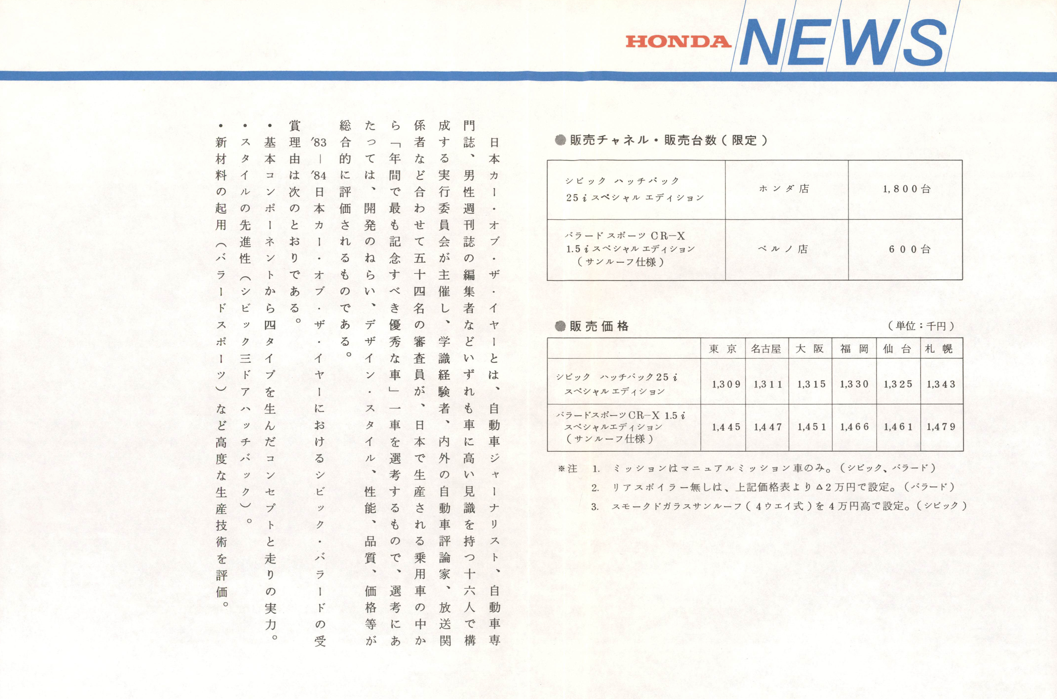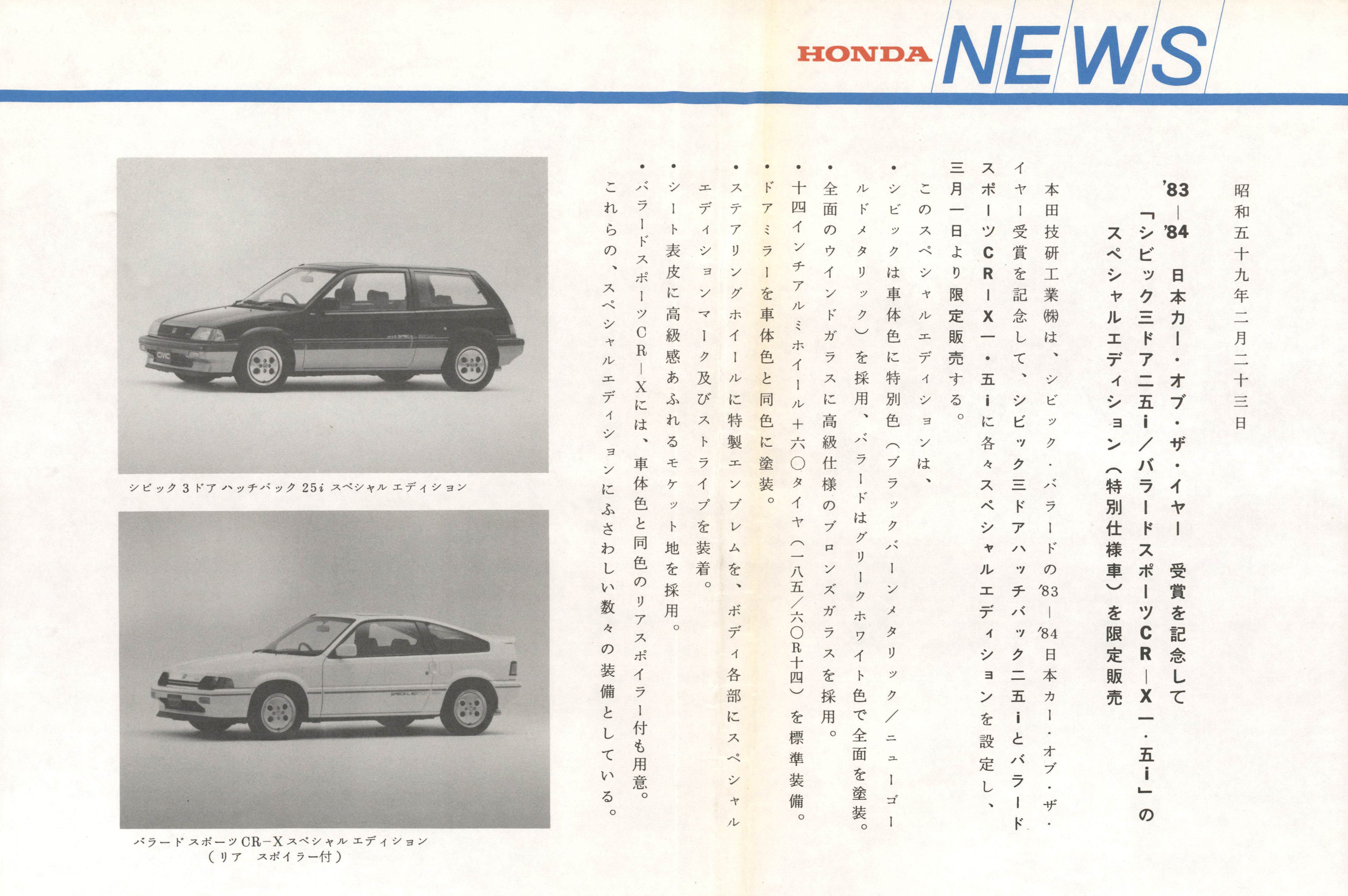83-'84日本カー・オブ・ザ・イヤー受賞を記念して「シビック三ドア二五i/バラードスポーツCR-X一・五i」のスペシャルエディション(特別仕様車)を限定販売