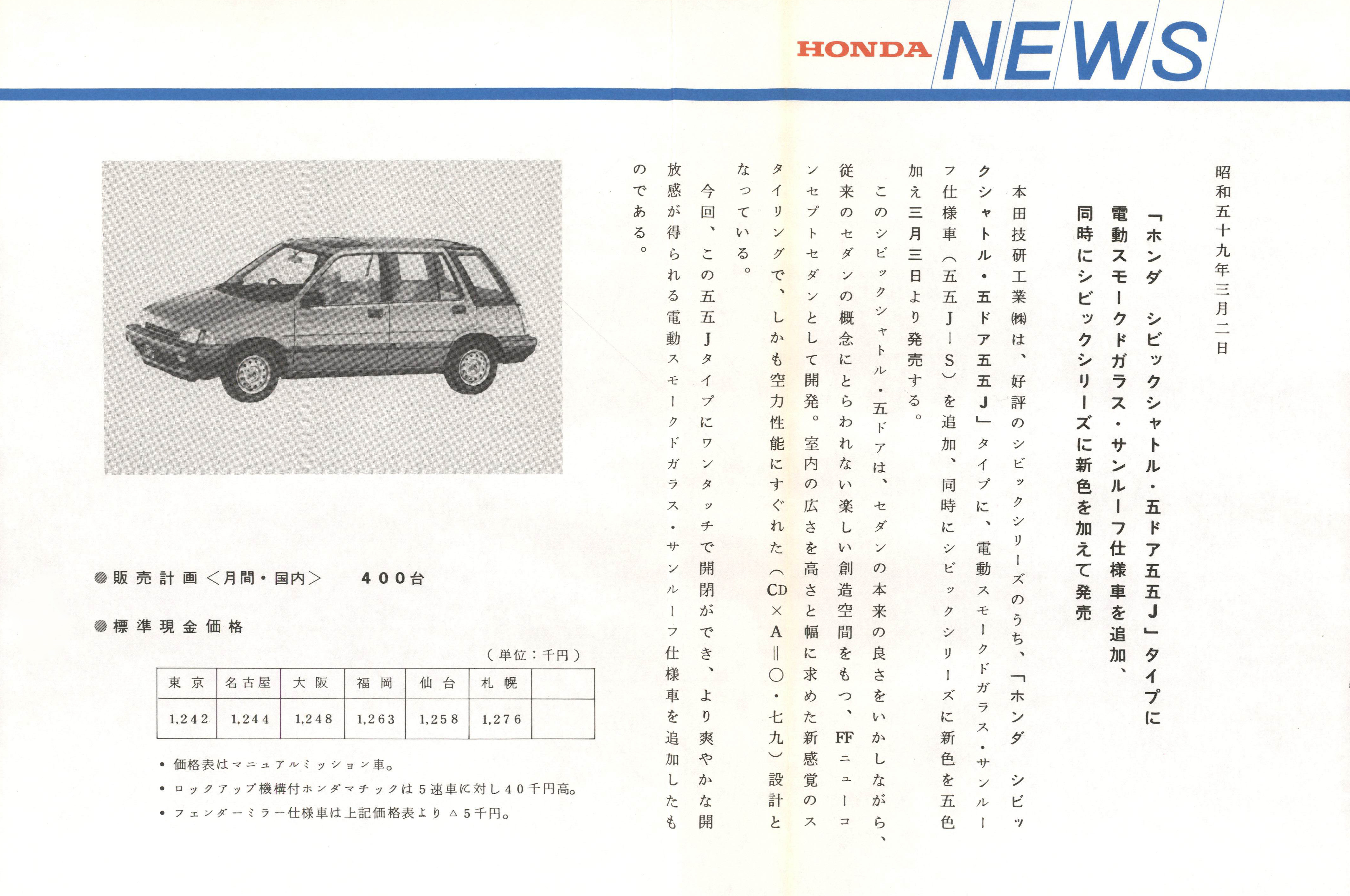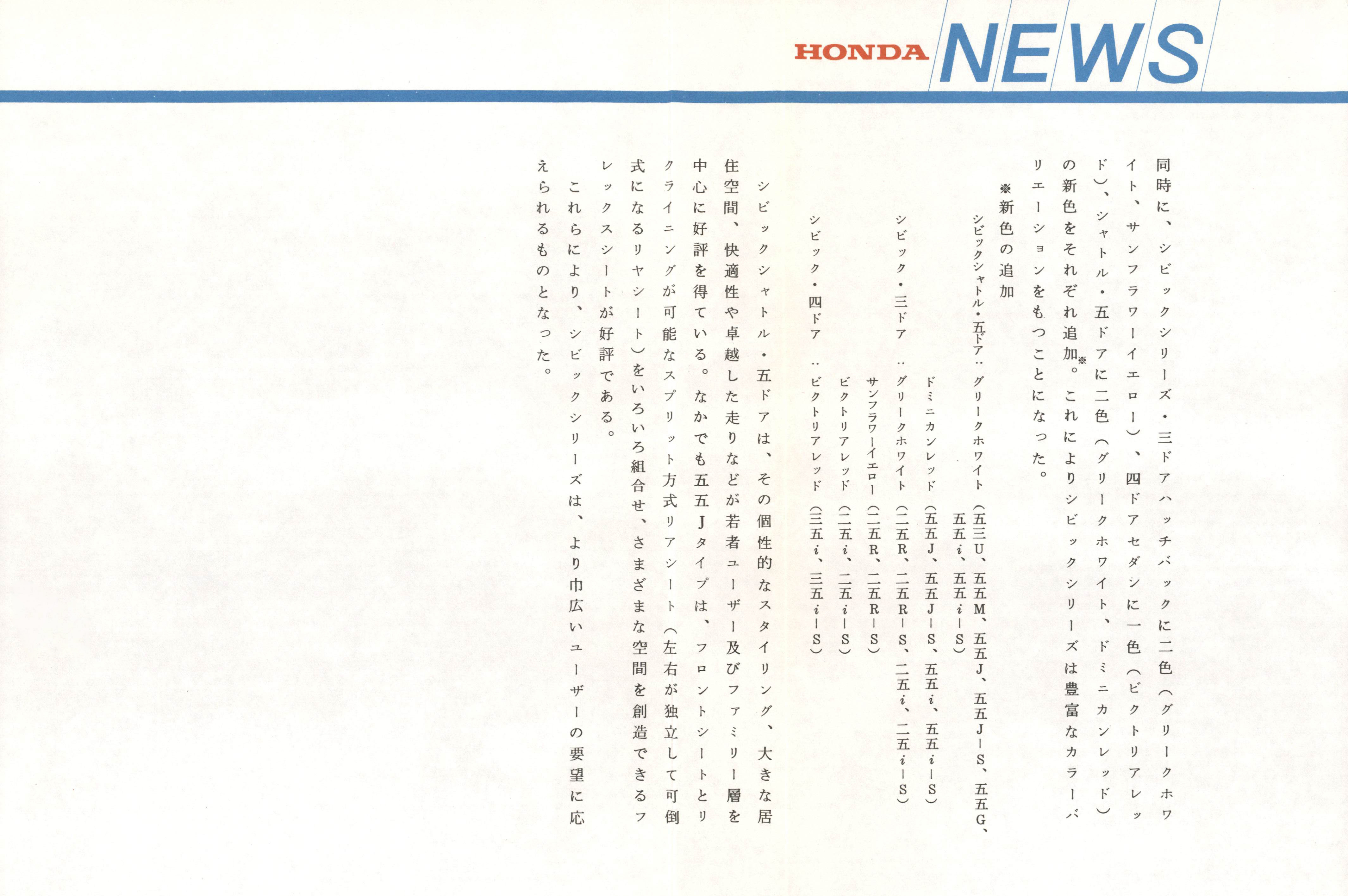 「ホンダシビックシャトル・五ドア五五J」タイプに電動スモークドガラス・サンルーフ仕様車を追加、同時にシビックシリーズに新色を加えて発売