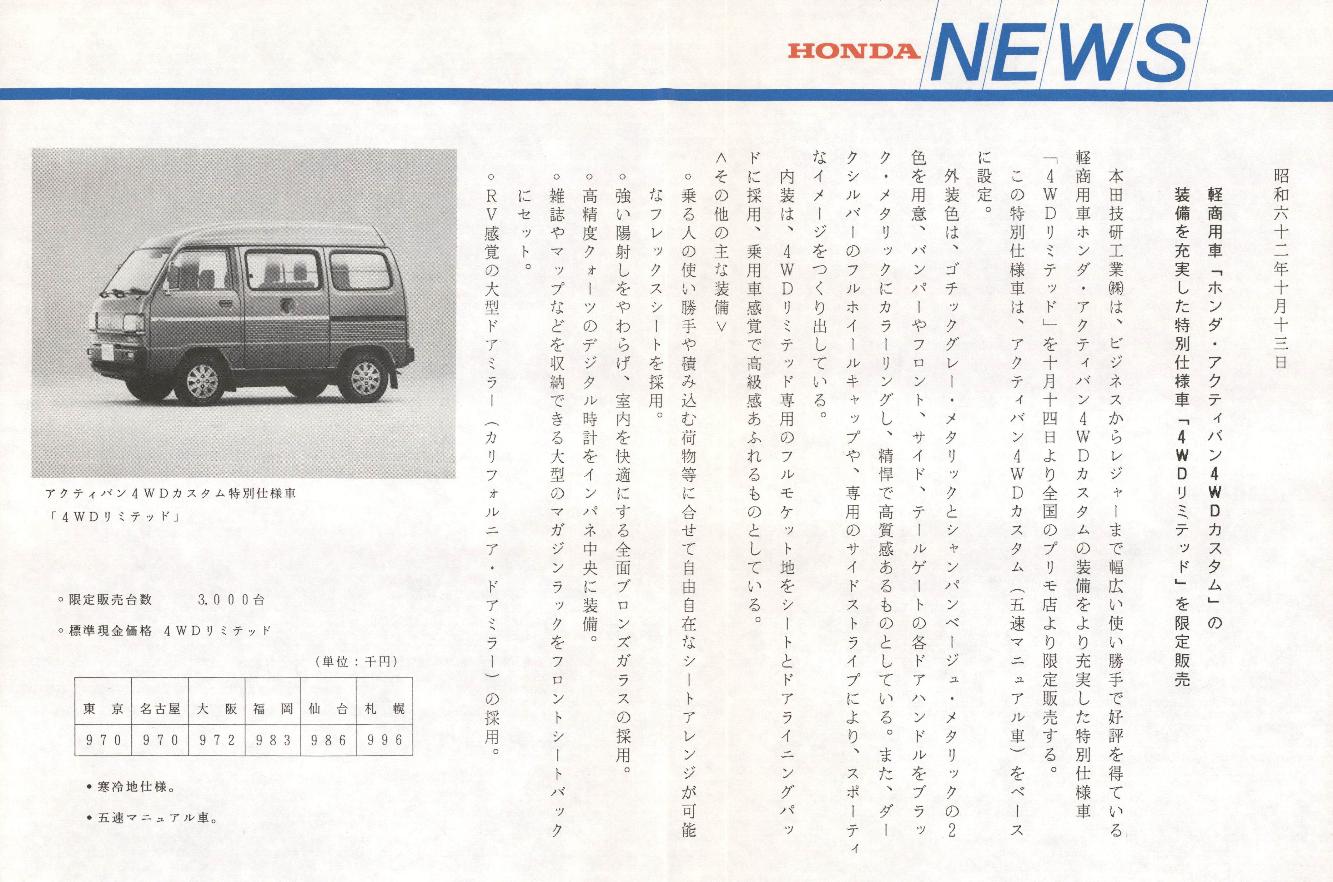 軽商用車「ホンダ・アクティバン4WDカスタム」の装備を充実した特別仕様車「4WDリミテッド」を限定販売