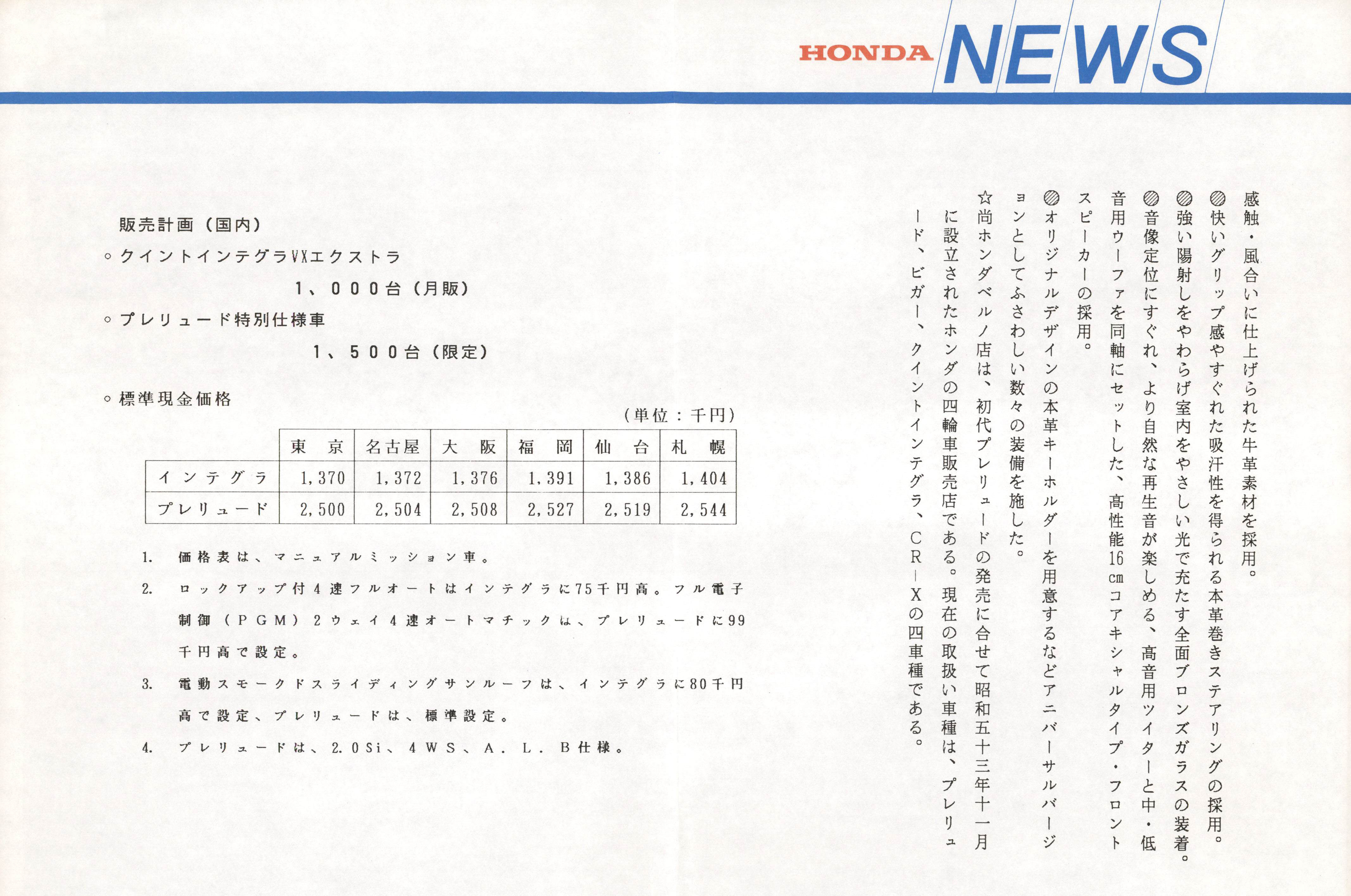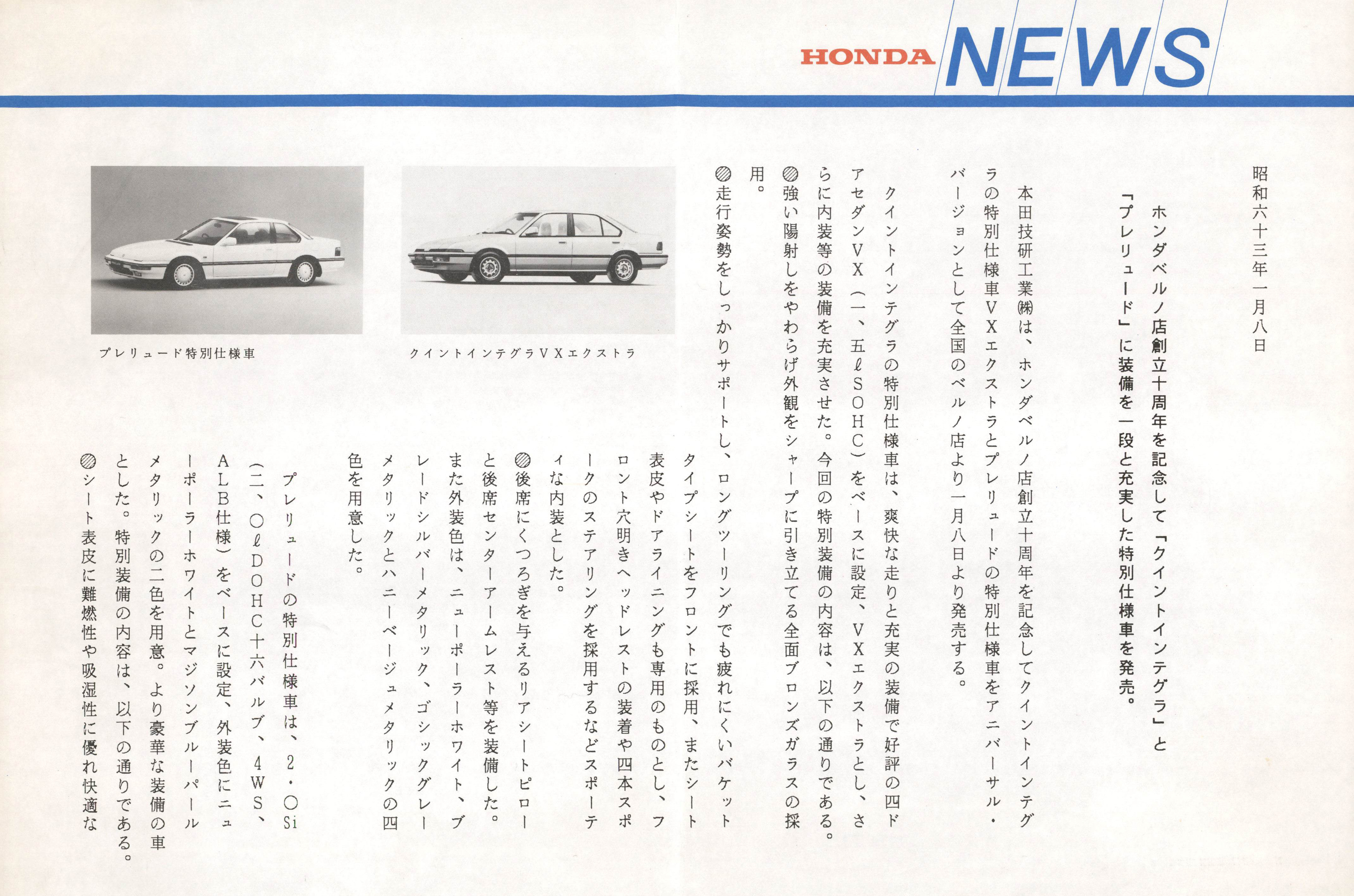 ホンダベルノ店創立十周年を記念して「クイントインテグラ」と「プレリュード」に装備を一段と充実した特別仕様車を発売