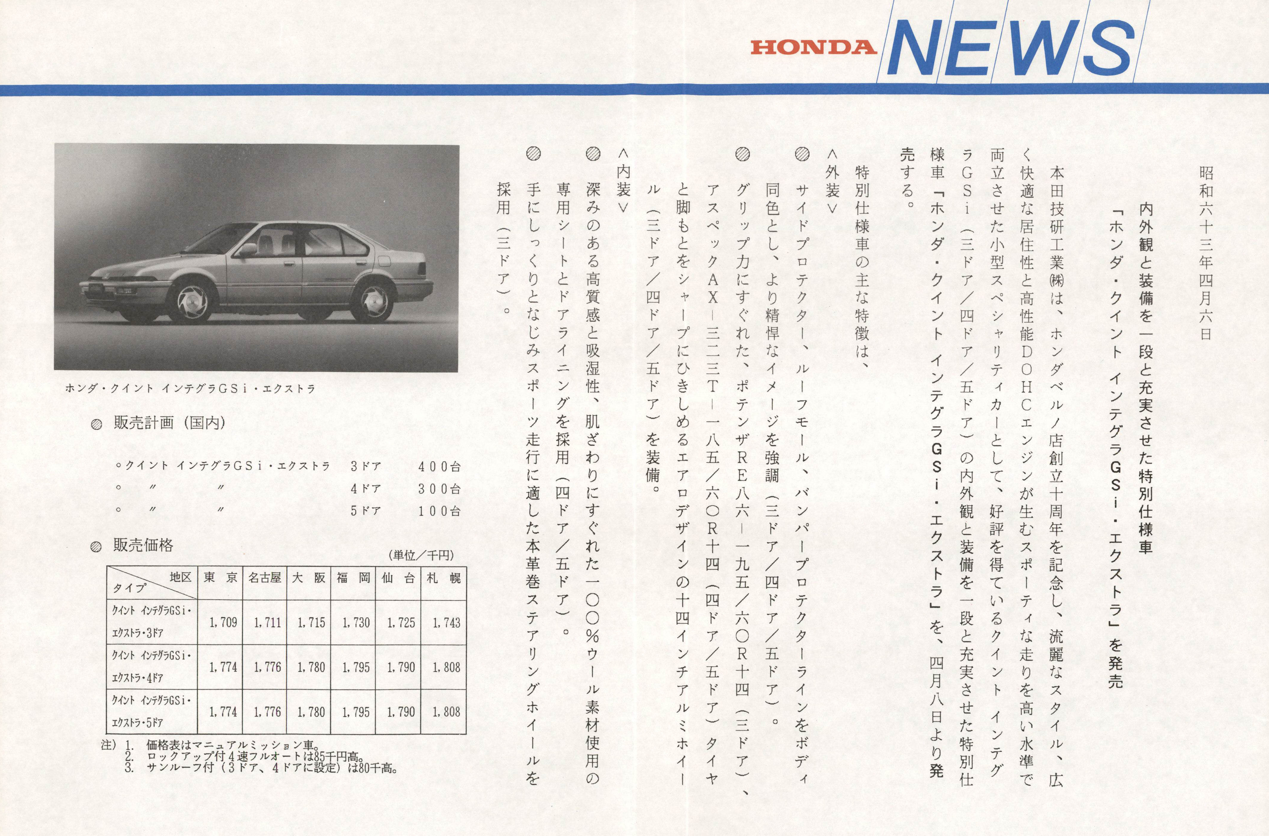 内外観と装備を一段と充実させた特別仕様車「ホンダ・クイントインテグラGSi・エクストラ」を発売
