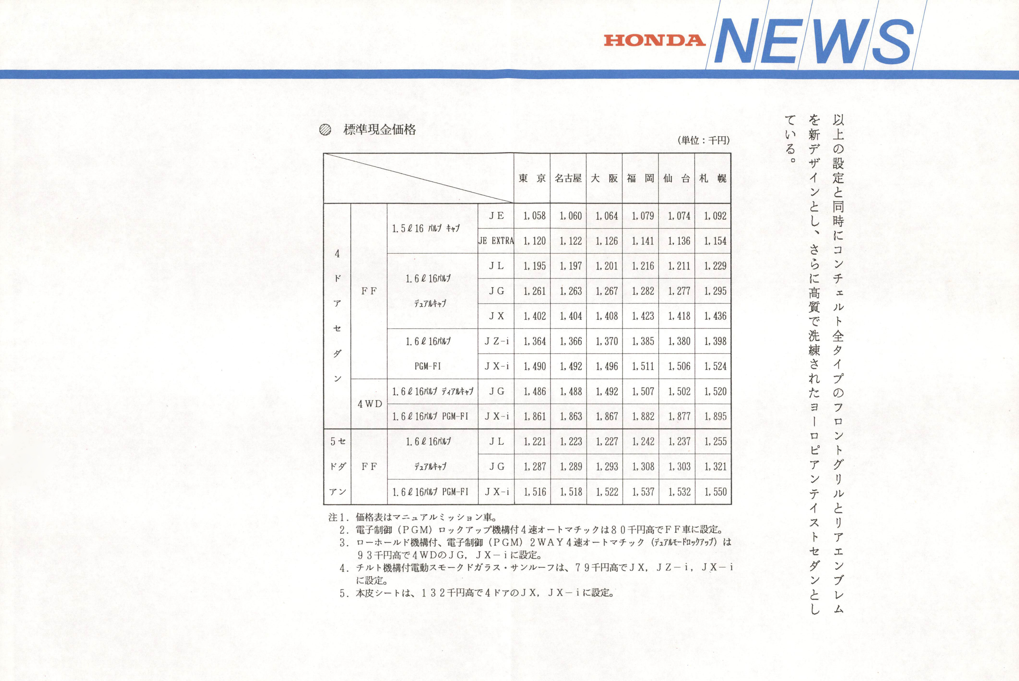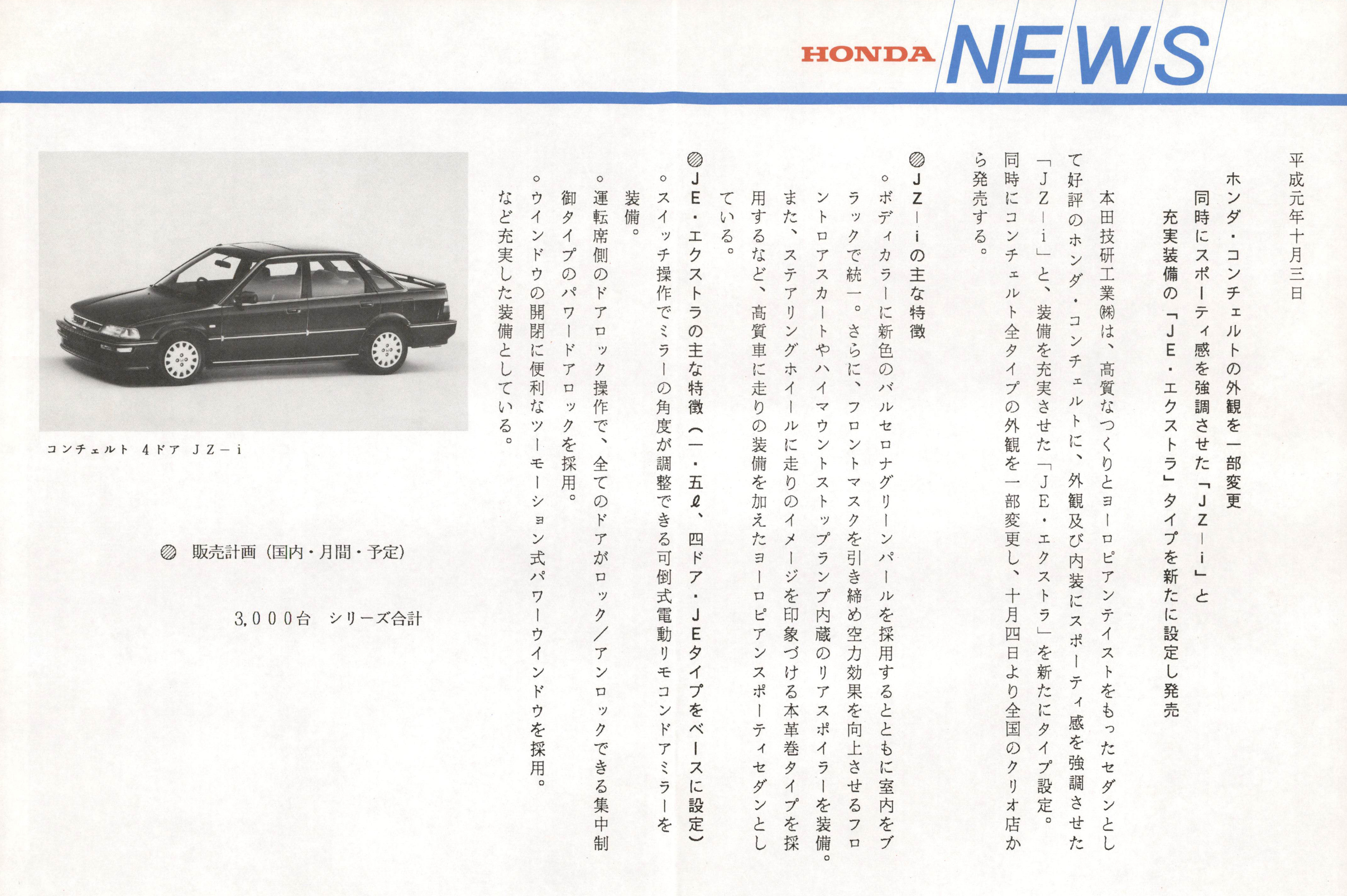 1989.10.03 ニュースリリース ホンダ・コンチェルトの外観を一部変更同時にスポーティ感を強調させた「JZ-i」と充実装備の「JE・エクストラ」タイプを新たに設定し発売 PDFでプレスリリース全文を読む (15.23 MB)