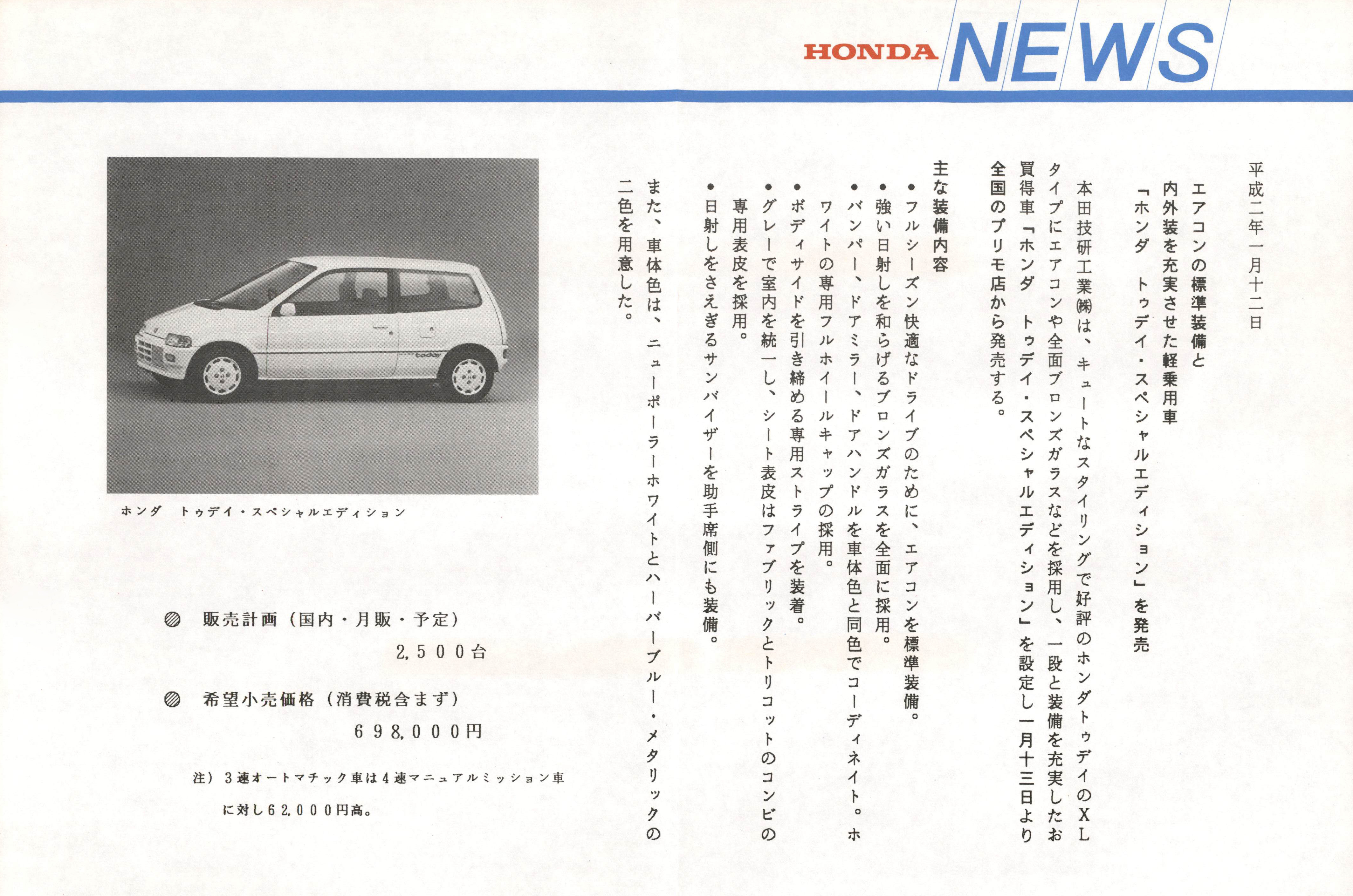 エアコンの標準装備と内外装を充実させた軽乗用車「ホンダトゥデイ・スペシャルエディション」を発売