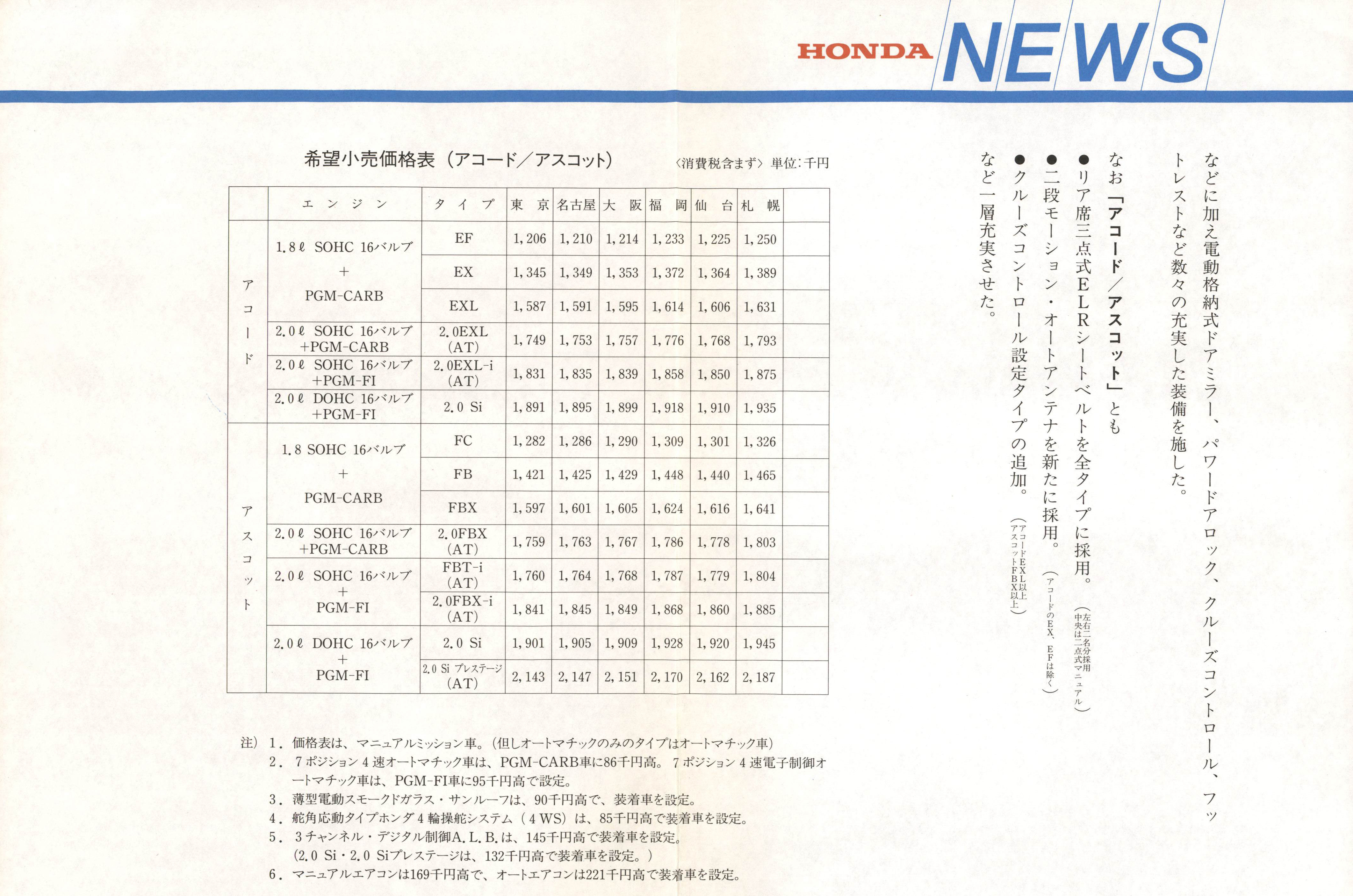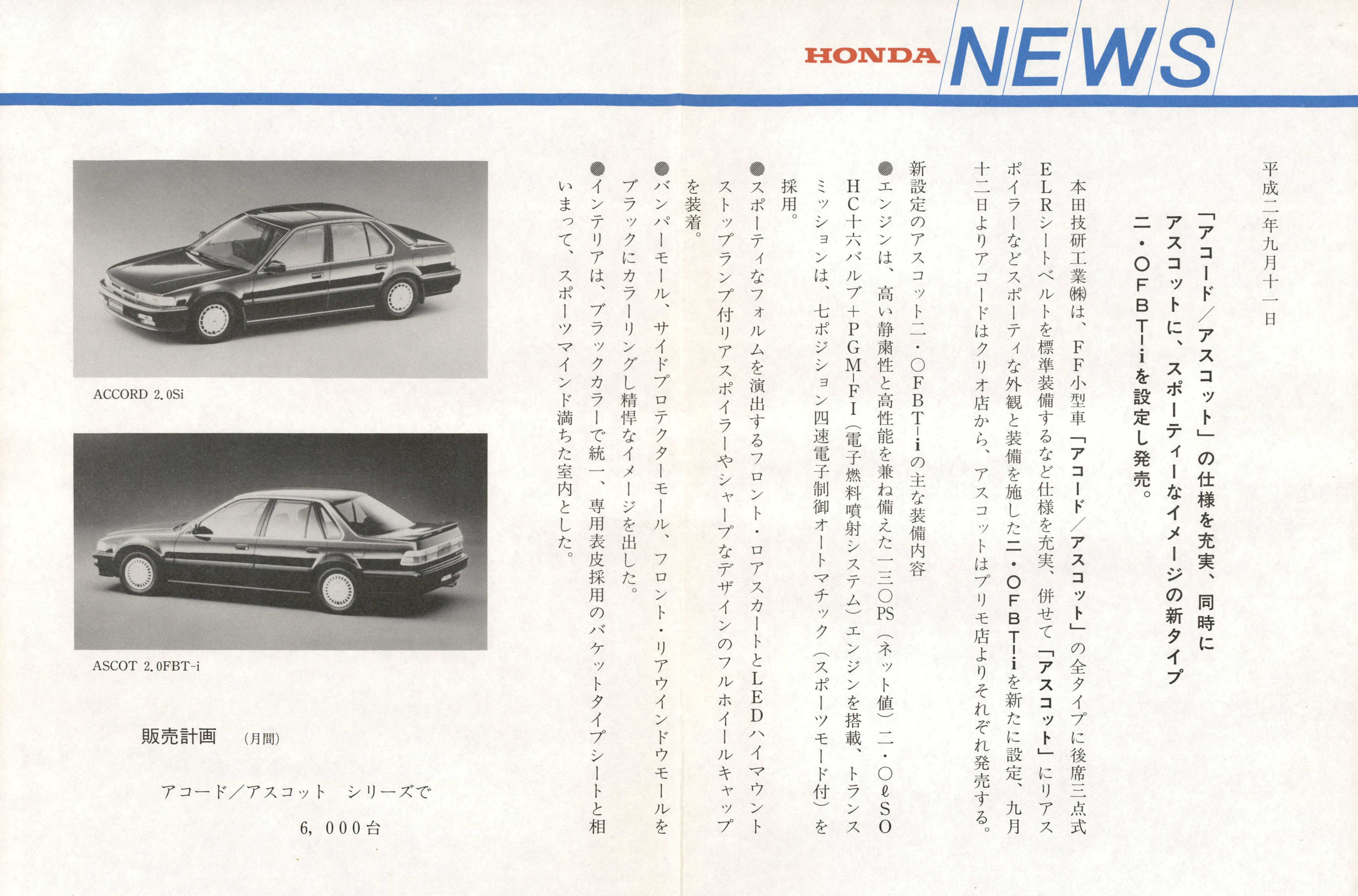 「アコード/アスコット」の仕様を充実、同時にアスコットに、スポーティーなイメージの新タイプ二・〇FBT-iを設定し発売