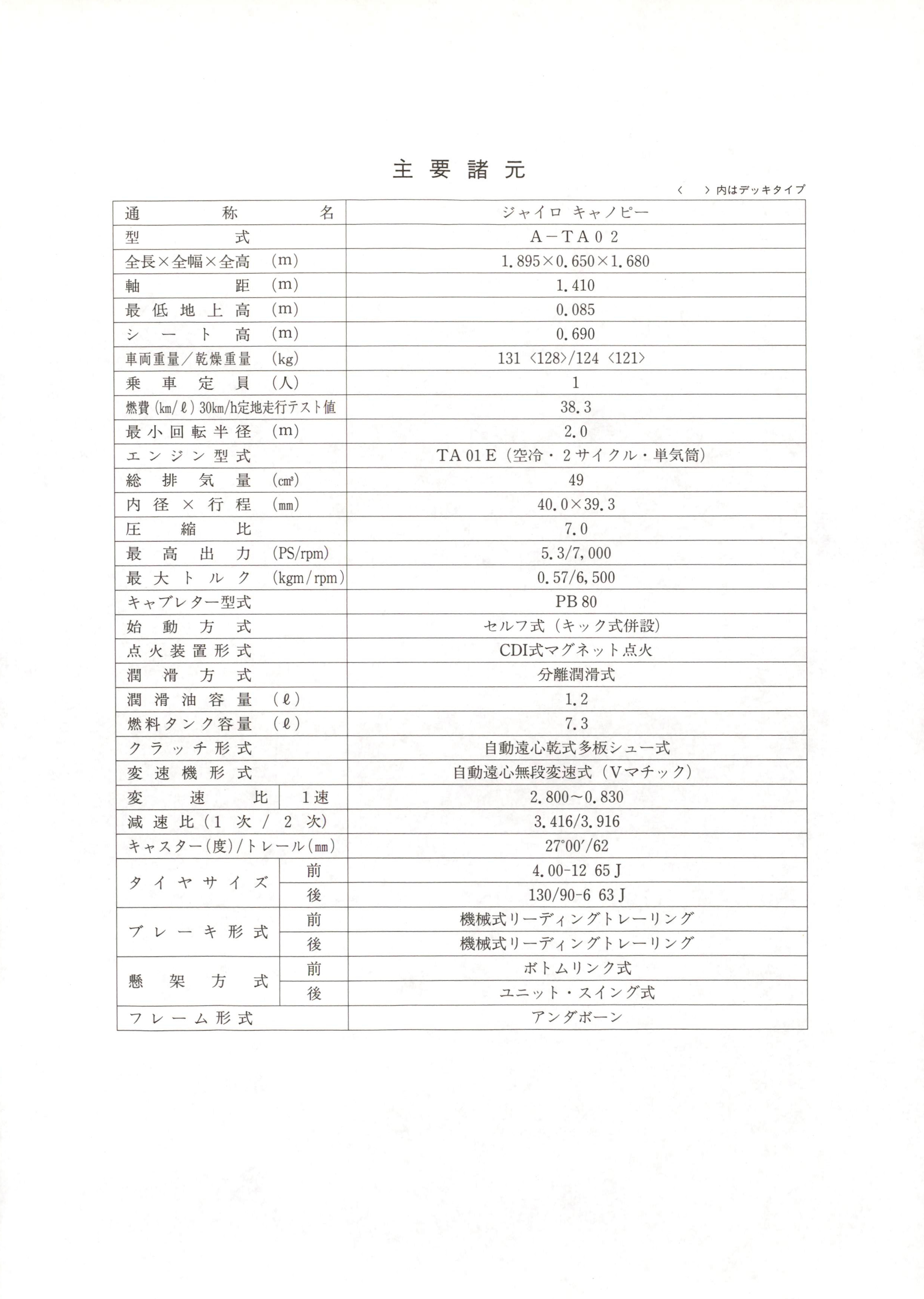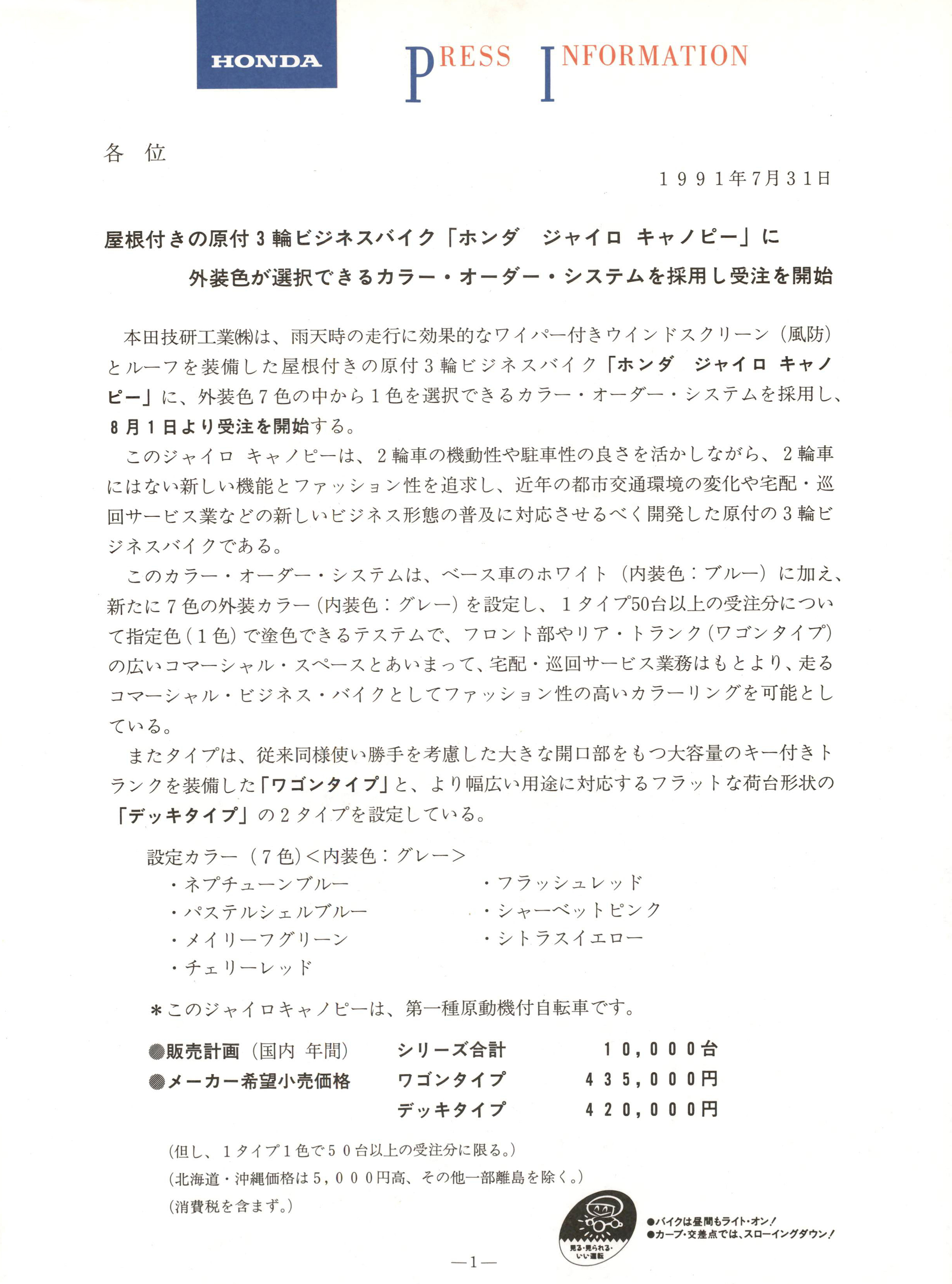 二P RESS I NFORMATION各 位1 9 9 1 年 7 月 3 1 日屋根付きの原付 3 輪ビジネスバイク「ホンダ ジャイロキャノピー」に外装色が選択できるカラー・オーダー・システムを採用し受注を開始本田技研工業掬は、雨天時の走行に効果的なワイパー付きウインドスクリーン(風防)とルーフを装備した屋根付きの原付 3 輪ビジネスバイク 「ホンダ ジャイロキャノピー」 に、外装色 7 色の中から 1 色を選択できるカラー ・オーダー ・シス テムを採用し、8 月 1 日より受注を開始する 。このジャイ ロ キ ャノピーは、 2 輪車の機動性や駐車性の良さを活かしながら 、 2 輪車にはない新しい機能とファ ッション性を追求し、近年の都市交通環境の変化や宅配 ・巡回サービス業などの新しいビジネス形態の普及に対応させるべく開発した原付の 3 輪 ビジネスパイクである。このカラー ・オーダー ・システムは、ベース車のホワイト(内装色 :ブルー)に加え、新たに 7 色の外装カラー(内装色:グレー)を設定し、 1 タイプ 50 台以上の受注分について指定色 (1 色)で塗色できるテステムで、フロント部やリア ・トランク(ワゴンタイプ)の広いコマーシャル ・スペースとあいまって、宅配 ・巡回サービス業務はもと より、走るコマーシャル ・ビジネス ・バイクとしてファ ッション性の高いカラーリングを可能としている。またタイプは、従来同様使い勝手を考慮した大きな開口部をもつ大容量のキー付き トランクを装備した 「ワゴンタイプ」 と、より幅広い用途に対応するフラットな荷台形状の「デッキタイプ」 の 2 タイプを設定している 。設定カラー (7 色)<内装色:グレー>・ネプチューンプルー・パステルシェルブルー・メイリーフグリーン・チ ェリーレ ッ ド・フラッシュレ ッド・シャーベットピンク・シトラスイエロー*このジャイ ロキャノピーは、第一種原動機付自転車です。●販売計画 (国内年間)●メーカー希望小売価格シリーズ合計ワゴンタイプデッキタイプ(但し、 1 タイプ 1 色で 5 0 台以上の受注分に限る。 )(北海道・沖縄価格は 5, 0 0 0 円高、その他一部離島を除く 。)(消費税を含まず。 )- 1 -1 0 , 0 0 0 台4 3 5 , 0 0 0 円4 2 0 , 0 0 0 円●パイクは畳間もライト・オン. I●カープ・交差点では、スローイングダウン. I主 要 諸 尤く 〉内はデッキタイプ通 称 名 ジャイロキャノピー升土 u式 A - T A 0 2全長 x 全幅 x 全高 (m ) 1. 895 X 0. 650 X 1. 680軸 距 (m) 1. 410最 低 地 上 高 (m ) 0.085シ 卜古 回(m)0.690車両重量/乾燥重量 (k g) 131 <128 〉 /124 <1 21 〉乗 車疋 ヶ 上員 (人) 1燃費 (km/ Q) 30km/h 定地走行テスト値 38.3最 小 回 転 半 径 (m) 2. 0エ ン ジ ン 型 式 T A O l E (空冷 ・ 2 サイクル・単気筒)総 排 気亙戸 1 一 (c 而) 49内 径 X 行 程 (mm) 40. 0X 39. 3圧 縮 比 7. 0最 高 出 力 (PS/r p m) 5.3/7,000最 大 ト ル ク (k g m/ r p m) 0.57/6,500キャブレター型式 PB80始 動 方 式 セルフ式(キック式併設)点 火 装 置 形 式 CDI 式マグネ ッ ト点火潤 滑 方 式 分離潤滑式潤 滑 油 容 量 (.e,) 1. 2燃 料 タ ン ク 容 量 (Q) 7. 3ク ラ ッ チ 形 式 自動遠心乾式多板シュー式変 速 機 形 式 自動遠心無段変速式 (V マチ ック)変 速 比 1 速 2.800~0.830滅 速 比 (1 次 / 2 次) 3.416/3.916キャスター(度)/トレール (mm) 27 ゜ 00'/62タ イ ヤ サ イ ズ月 9 9 1 J4. 00-12 65 J後 130/90-6 63 Jプ レ ー キ 形 式月 9 9 1 j機械式リーディングトレーリング後 機械式リーディングトレーリング懸カ木 ロ方 式月 9 9 1 Jボトムリンク式後 ユニ ッ ト・スイング式フ レ ー ム 形 式 アンダボーン