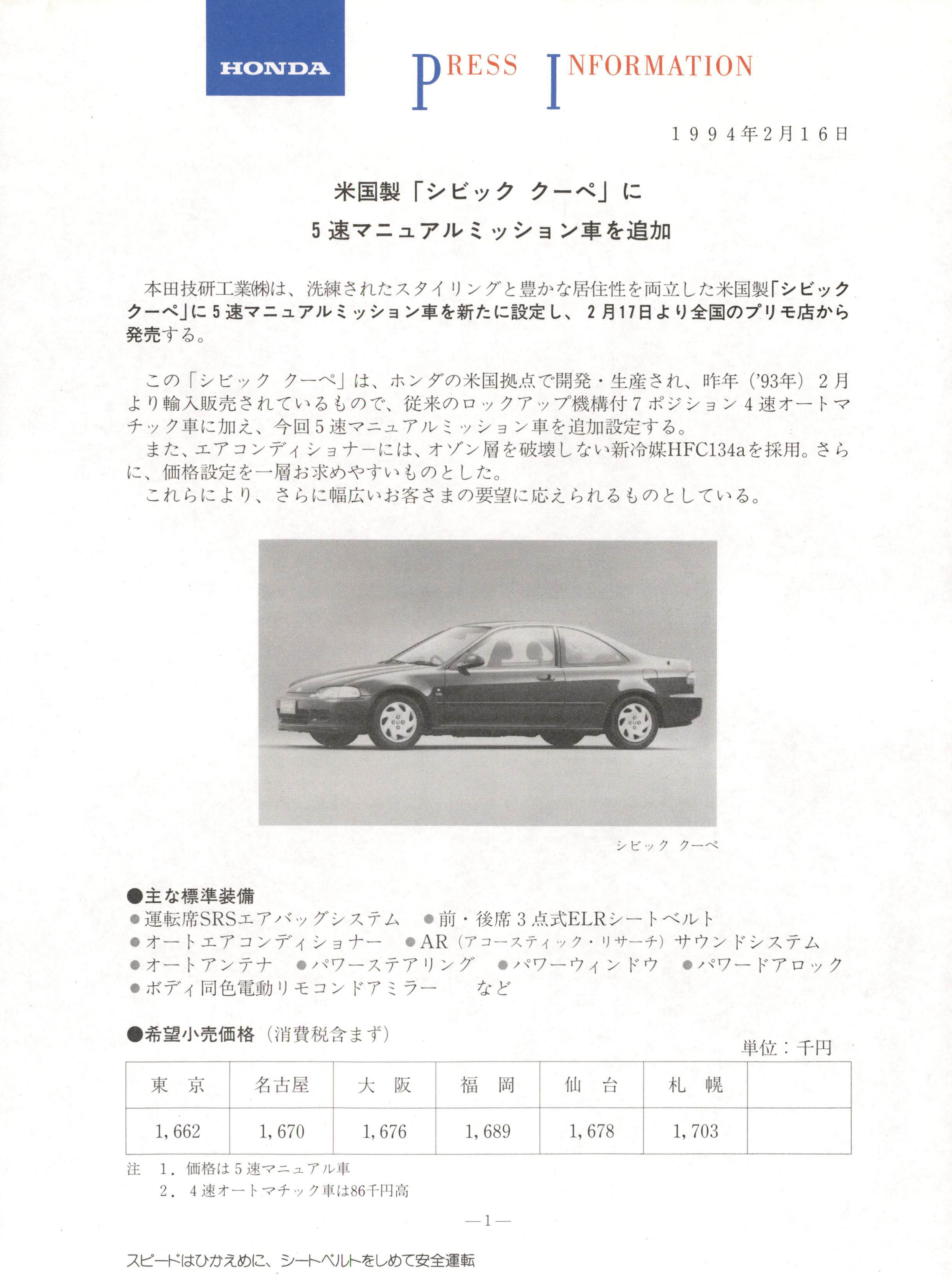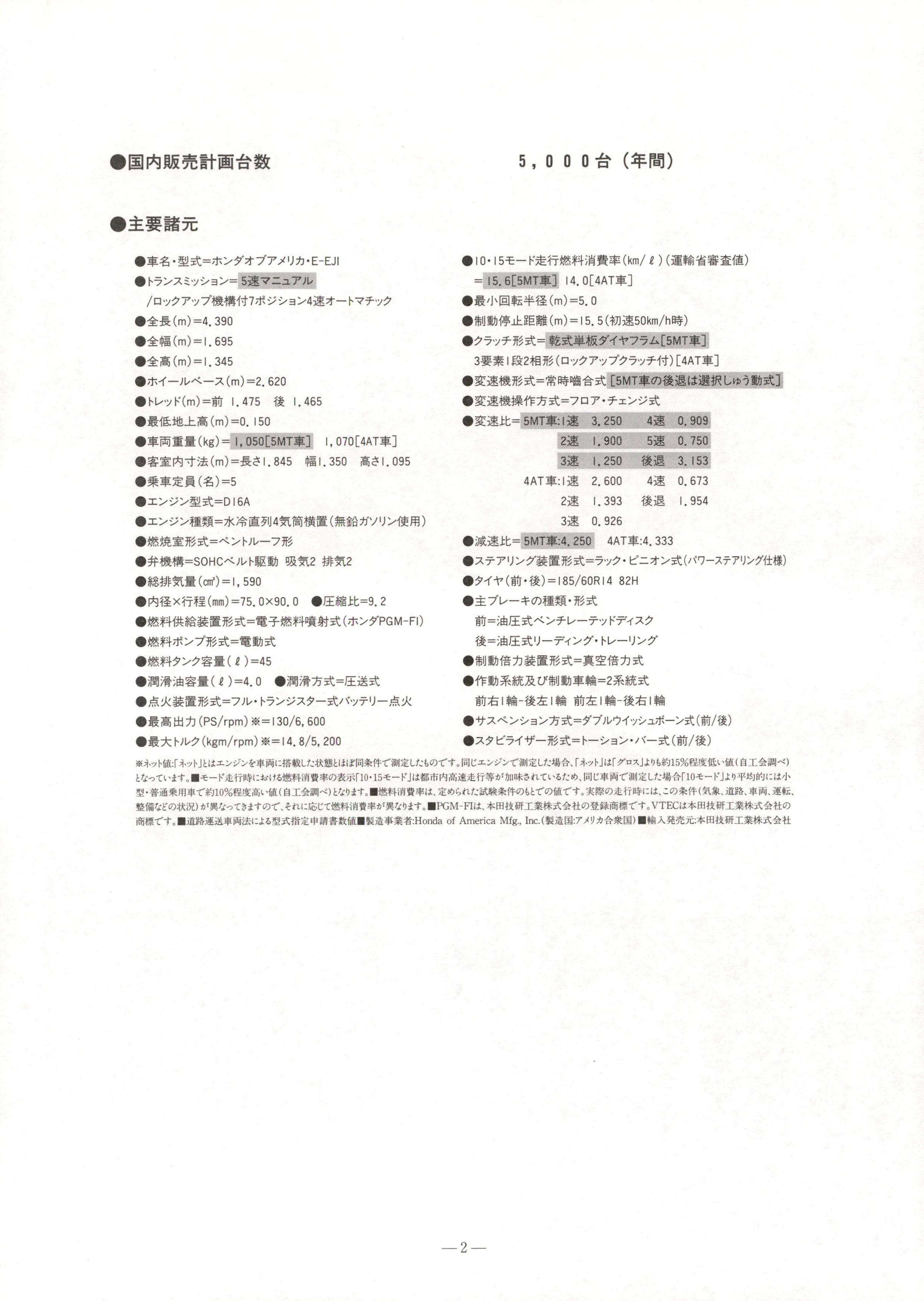 ��b~DA! P RESS INFORMATION1 9 9 4t^2g16�es|�V��0�0�0�0�0�0�0�00k05��0�0�0�0�0�0�0�0�0�0ʎ�0���R,g0u�bx�]mi'fo00m�}U0�0_0�0�0�0�0�0�0h0J�K0j0E\OO'`�0!N�zW0_0s|�V��0�0�0�0�0�0�0�00k05��0�0�0�0�0�0�0�0�0�0ʎ�0�e_0k0-��[W002g17�e�0�0hQ�Vn0�0�0�0�^K0�0zv�XY0�00S0n00�0�0�0�0�0�0�00o00�0�0�0n0s|�V�b�pg0��zv�0u#uU0�00(ft^('93t^ � 2g�0�08�eQ���XU0�0f0D0�0�0n0g00�_egn0�0�0�0�0�0�0_j�i�N7�0�0�0�0�04��0�0�0�0�0�0�0ʎk0�RH00�N�V5��0�0�0�0�0�0�0�0�0�0ʎ�0���R-��[Y0�00~0_00�0�0�0�0�0�0�0�0�0�0k0o00�0�0�0d\�04x�XW0j0D0�e�Q�ZHFC134a�0�c(u0U0�0k00�O<h-��[�0Nd\J0Bl�0�0Y0D0�0n0h0W0_00S0�0�0k0�0�00U0�0k0E^�^D0J0�[U0~0n0��gk0�_H0�0�0�0�0n0h0W0f0D0�00�0�0�0�0�0�0�0�%;Nj0j�nň�P�%K��-^SRS�0�0�0�0�0�0�0�0�0�%MR�0�_-^3�p_ELR�0�0�0�0�0�0�%�0�0�0�0�0�0�0�0�0�0�0�0�0" AR � �0�0�0�0�0�0�0�0�0�0�0�0�0 � �0�0�0�0�0�0�0�0�%�0�0�0�0�0�0�0�%�0�0�0�0�0�0�0�0�0�%�0�0�0�0�0�0�0�0�%�0�0�0�0�0�0�0�0�%�0�0�0Tr����R�0�0�0�0�0�0�0�0�0j0i0�%^g\�X�O<h��m��z+T~0Z0 �XSMO�CS�Qqg�NT�SK\'Y*��y�\�N�S-gL^1,662 1,670 1,676 1,689 1,678 1,703�l1��O<ho05��0�0�0�0�0ʎ2. 4��0�0�0�0�0�0�0ʎo086CS�Qؚ--l-�0�0�0�0o0r0�RH0�0k00�0�0�0�0�0�0�0W0�0f0�[hQK���%�V�Q���X�;u�Spe�%;N����CQ�% ʎT�0�W_��0�0�0�0�0�0�0�0�0�0E-EJI�% �0�0�0�0�0�0�0�0�0� 5��0�0�0�0�0��0�0�0�0�0�0_j�i�N7�0�0�0�0�04��0�0�0�0�0�0�0�%hQw�(m)=4.390�% hQE^(m)=I. 695�% hQؚ(m)=I . 345�% �0�0�0�0�0�0�0(m)=2.620�% �0�0�0�0� m) �MRI. 475 �_I. 465�% gNO0WNؚ�m)=O.150�% ʎ!N͑ϑ(k g �� �^.QSO[[Ml�N=� 1,070[4AT ʎ=��% �[�[�Q�[�l�m)�w�U0I.845 E^I. 350 ؚU0I. 095�% WNʎ�[�T�T ��5�% �0�0�0�0�W_� D16A�% �0�0�0�0.z^��4l�Q�vR4lR{*jn�!q[��0�0�0�0O(u ��% �q<q�[b__��0�0�0�0�0�0b_�% __j�i�SOHC�0�0�0ƙ�R8Tl2 �cl2�% �}�clϑ�an')=I, 590�% �Q�_xL�z(mm)=75. 0X90. 0 �%'W.~�k�9. 2�% �q�e�Of}ňnb__���P[�q�etV\_��0�0�0PGM-FI)�%�q�e�0�0�0b__����R_�%�q�e�0�0�0�[ϑ� �)=45�%do�n�l�[ϑ(�)=4.0 �%do�n�e_�'W�_�%�pkpňnb__��0�0�0�0�0�0�0�0�0�0_�0�0�0�0�0�pkp�%gؚ�Q�R(PS/rpm); =130 /6, 600�%g'Y�0�0�0(k gm/rpm); =14.8/5, 2005, 0 0 0�S�t^�� ��% 10 �015 �0�0�0p�L��q�e�m���s(km /i �� K�*�w�[�g$P �=.15. 6[5MT͎=� il4.0[4AT ʎ=��% g\�V�JS�_� m)=S. 0�% 6R�R\Pbkݍ�� m)=IS. 5�R�SOkm/hBf ��% �0�0�0�0b__��0~N_�g�0�0�0��0�0[5MTʎ=�3�� }l�k2�vb_��0�0�0�0�0�0�0�0�0�0�N �;� 4ATʎ=��% Y�_jb__�8^Bf[VT_�S�~vr��0�Q��Nx�N�% Y�_j�d\O�e_��0�0�0�0�0�0�0�0_�% Y��k��v�N\� I`��t�_0S0 i�S��0��53�N�N&To �_�3. 153,'Z0Z0000 ? ~`�S� " �0�04ATʎ� l�2.600 4�0.6732�I. 393 �_�I. 9543�o. 926�%n��k�r5MTʎ� 4. 250J 4ATʎ� 4.333" �% �0�0�0�0�0�0ňnb__��0�0�0�0�0�0�0�0_��0�0�0�0�0�0�0�0�0�N�i ��%�0�0�0�MR�0�_ �� 185 /60Rl4 82H�%;N�0�0�0�0n0.z^��0b__MR��l'W_�0�0�0�0�0�0�0�0�0�0�0�0�_��l'W_�0�0�0�0�0�0�0�0�0�0�0�0�0�%6R�RP�Rňnb__�wzzP�R_�%\O�R�|q}�Ss06R�Rʎ*�� 2�|q}_MR�Sl*��0�_�]1*�MR�]l*��0�_�Sl*��% �0�0�0�0�0�0�0�e_��0�0�0�0�0�0�0�0�0�0�0_�MR��_ ��%�0�0�0�0�0�0�0b__��0�0�0�0�0�0�0�0_�MR��_ �; �0�0�0$P�0�0�0�00h0o0�0�0�0�0�0ʎ!Nk0-d �W0_0�rKah0o01i0Tag�Nf0,n�[W0_0�0n0f0Y00TX0�0�0�0�0f0,n�[W0_04XT00�0�0�00o00�0�0�00�0�0�0}15 �z�^NOD0[� (��]O��y0 �h0j0c0f0D0~0Y00�%�0�0�0p�L�Bfk0J0Q0�0�q�e�m��RSn0h�:y010 �015�0�0�00o0��^�Qؚ�p�L�I{L0�RsTU0�0f0D0�0_0�00TX0ʎ!Nf0,n�[W0_04XT010�0�0�00�0�0s^GW�vk0o0\�W�0nf�WN(uʎf0}10 �z�^ؚD0$P���]O��y0 �h0j0�0~0Y0��%�q�e�m���so00�[�0�0�0_0f��ag�Nn0�0h0f0n0$Pf0Y00�[��n0p�L�Bfk0o00S0n0ag�N�la�0S��0ʎ!N0K��0te�Pj0i0n0�r�l �L0puj0c0f0M0�0Y0n0f00]0�0k0�_X0f0�q�e�m��W[L0puj0�0~0Y0� �PGM-FI o00,g0u�bx�]mi*h_O>yn0{v2�FUjf0Y00VTECo0,g0u�bx�]mi*h_O>yn0FUjf0Y00�% S�k�K��ʎ!N�lk0�0�0�W_c�[3u��L�pe$P" �� ��Nmi�� Honda of Ameri ca Mfg., Inc ���� ��V��0�0�0�0T_g�V � �%8�eQzv�XCQ�,g0u�bx�]mi*h_O>y-2-